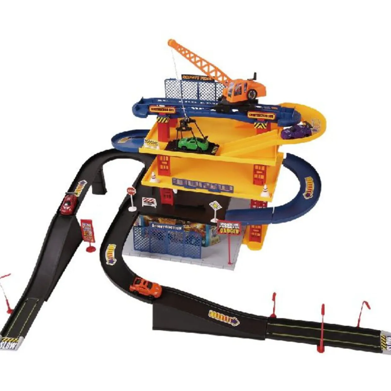 Jeu de construction d’un parking à plusieurs niveaux, d’une dimension de 80x70x45 cm, en plastique. Possédant un monte-charge à poulie. Il comprend : 4 voitures et divers accessoires. Dès 3 ans.