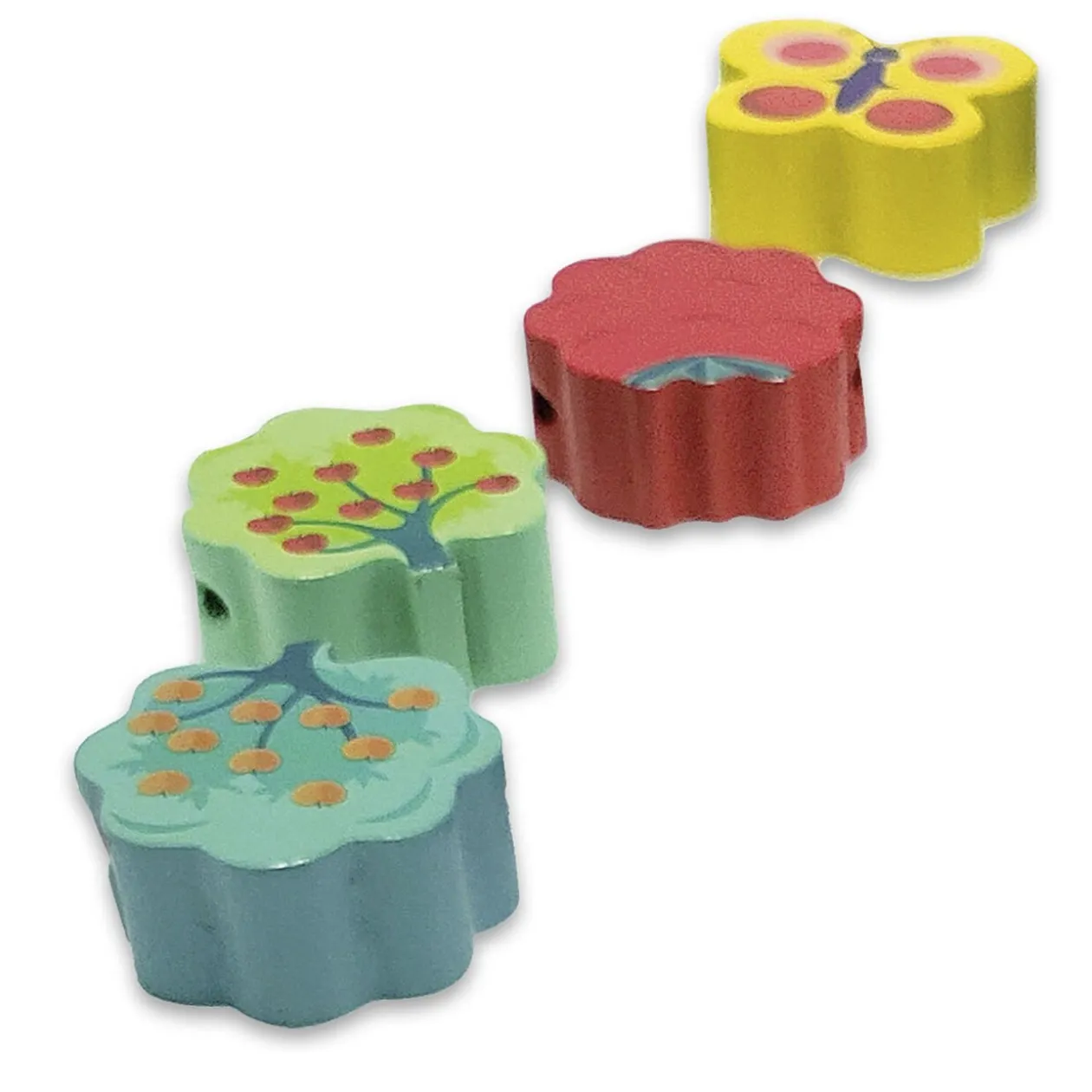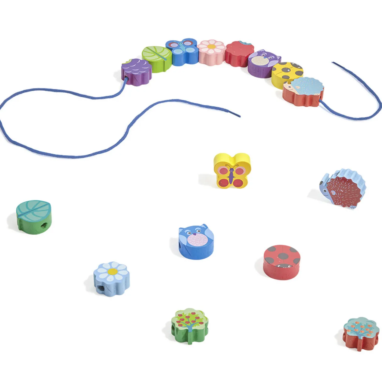 Le coffret comprend 16 perles XL qui représentent des animaux (hibou, papillon, coccinelle, hérisson…) et des éléments de la forêt (arbre fruitier, feuille, fleur…) ainsi qu’une cordelette sur laquelle enfiler les perles.