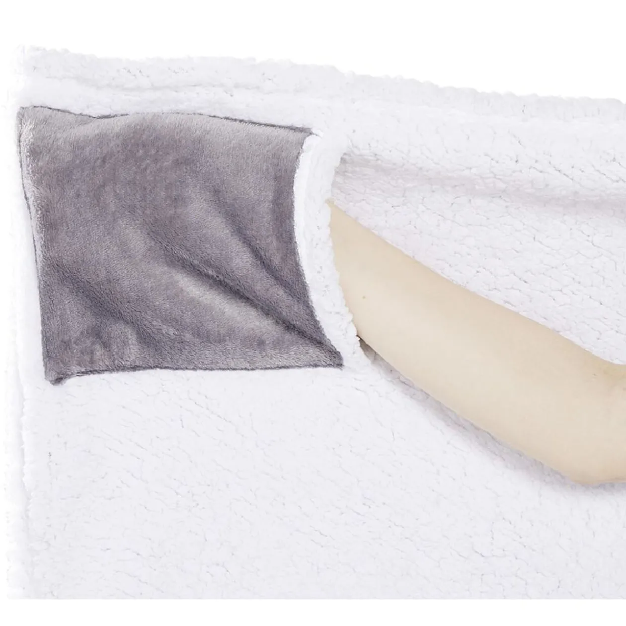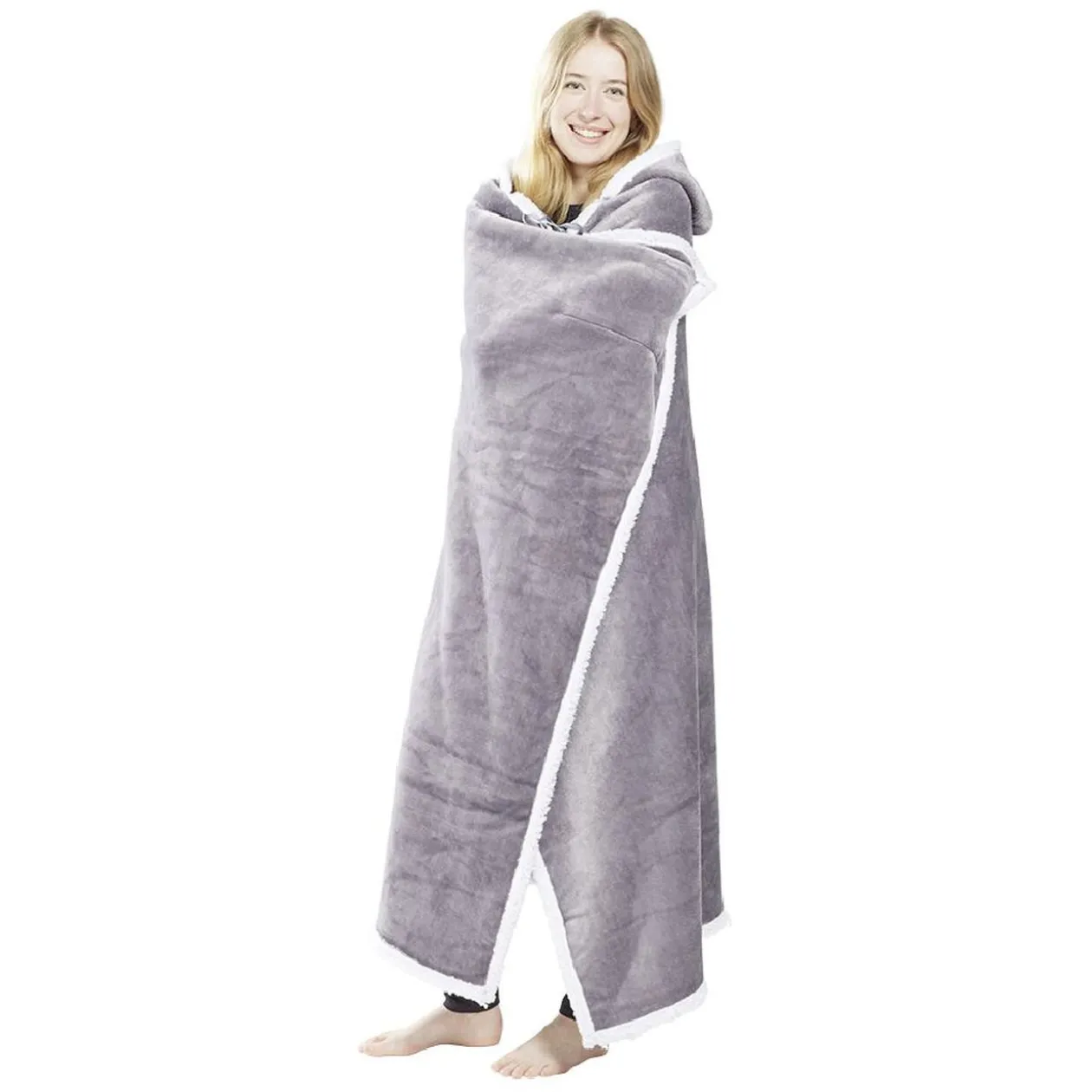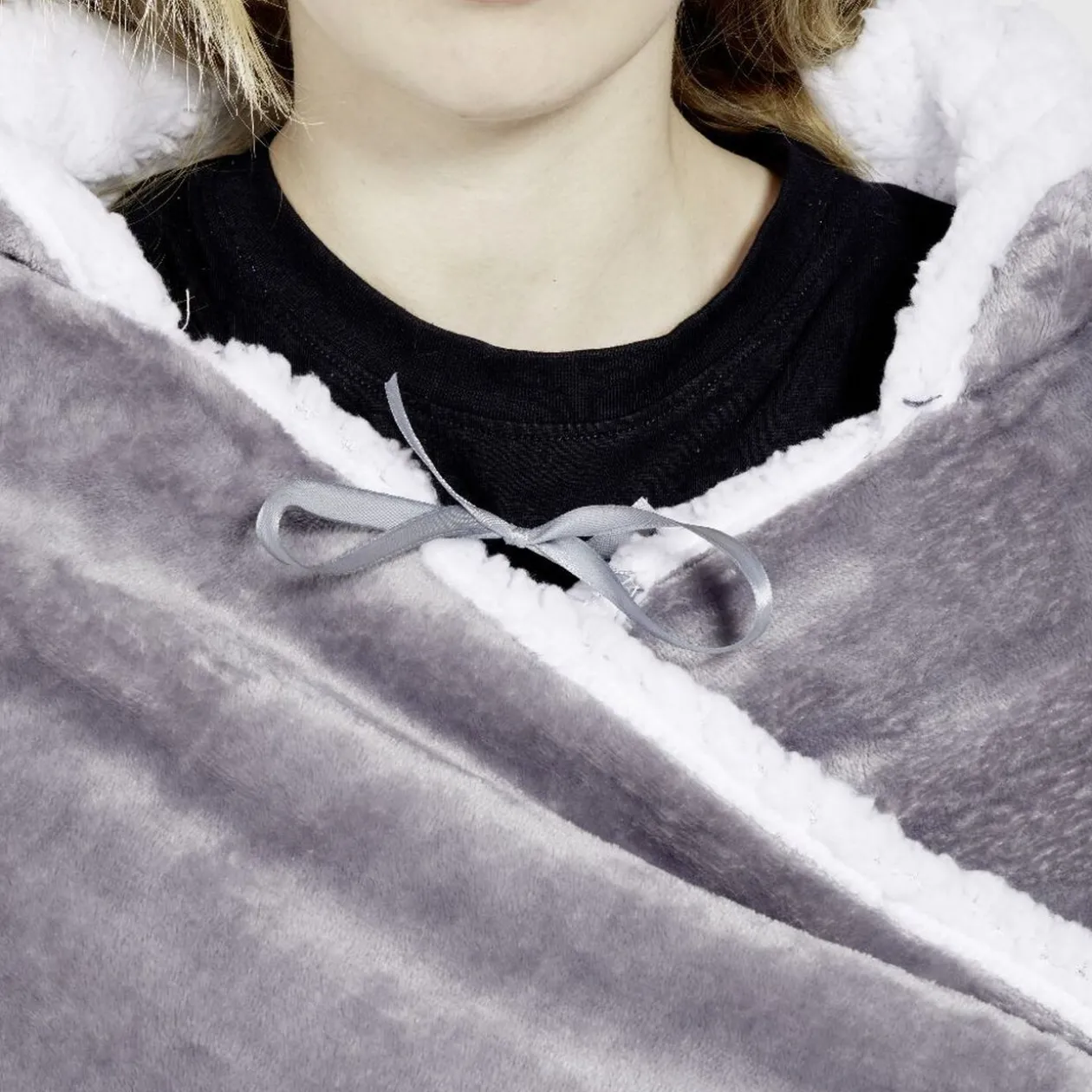 Offrez-vous un peu de confort et douceur avec ce plaid sweat à capuche en sherpa blanc sur l’intérieur.