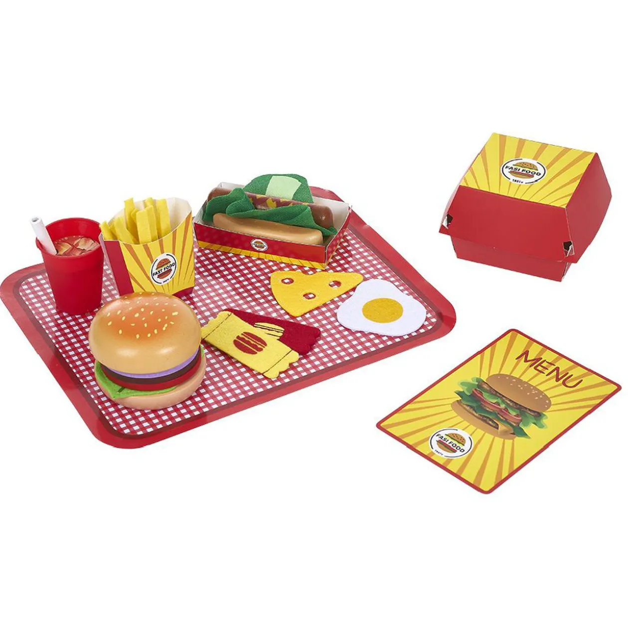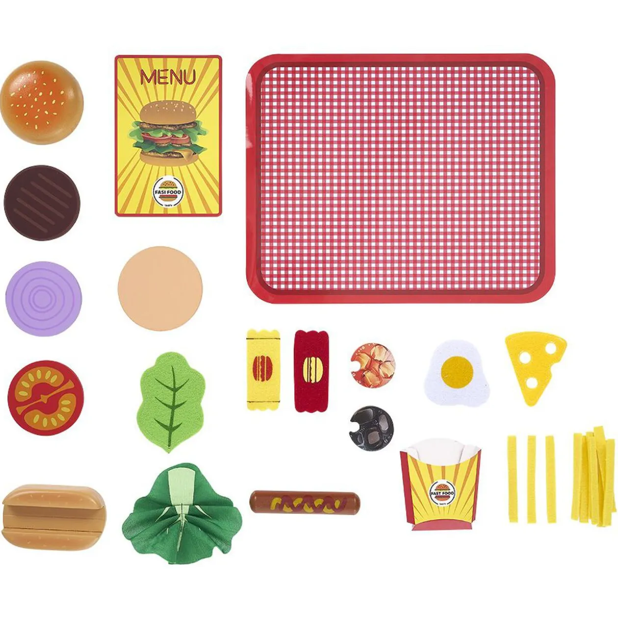 Plateau de fast food en bois certifié FSC®comprenant 1 plateau, 1 burger, des emballages, des ingrédients, 1 hot dog, des frites, 1 boisson, 1 carte menu et des sauces.