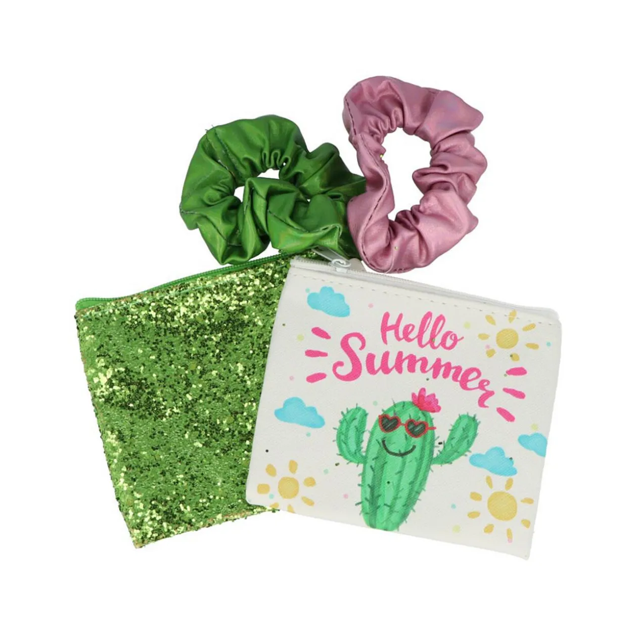 Ce set coloré au look estival composé de 2 pochettes à maquillage et 2 élastiques assortis sera parfait pour ranger vos cométiques et petits accessoires de coiffures durant les vacances.