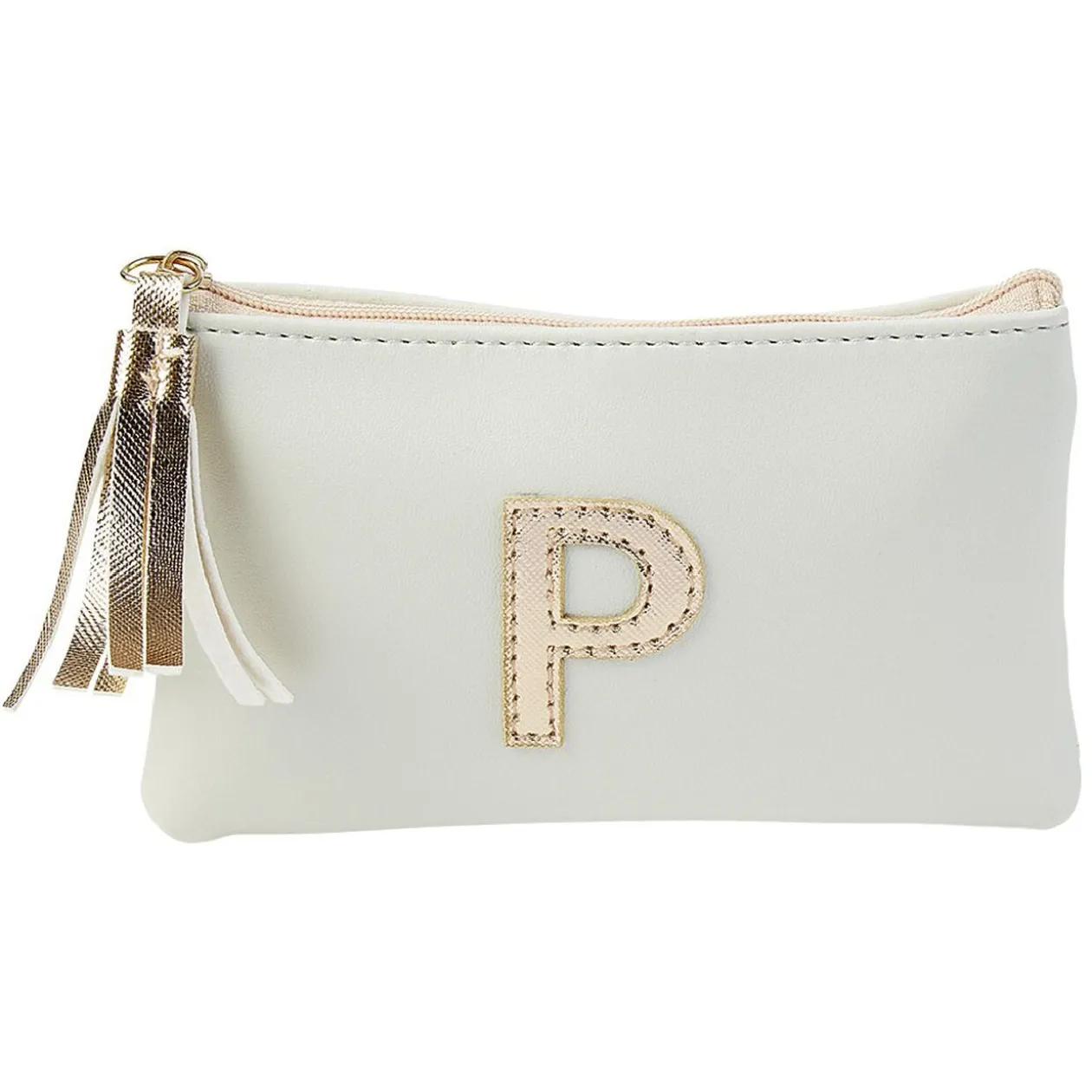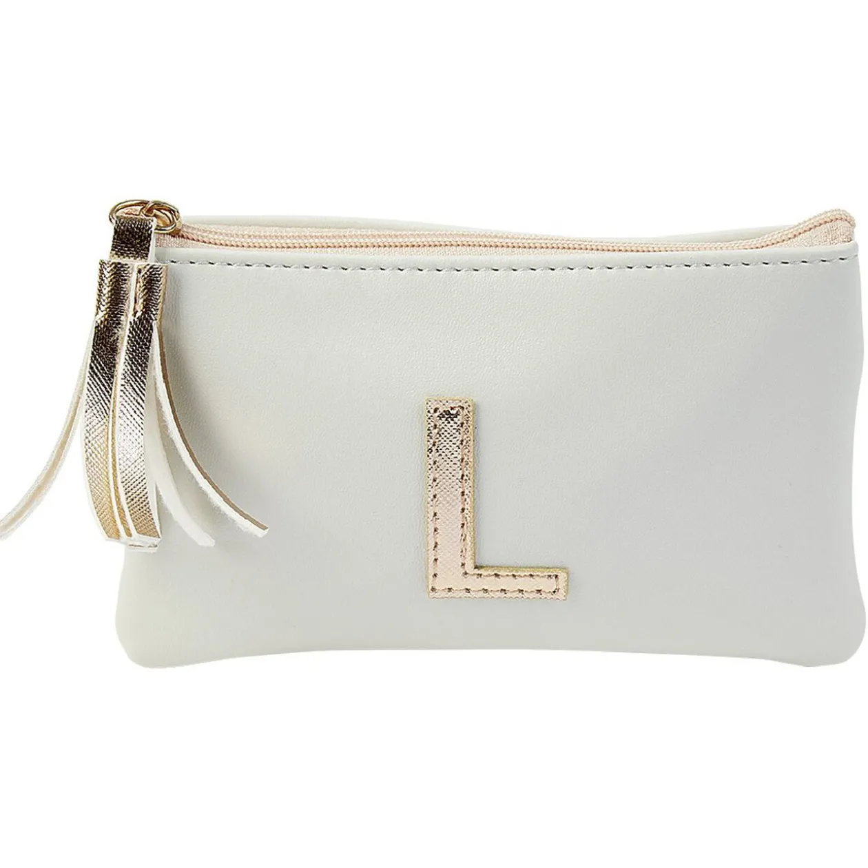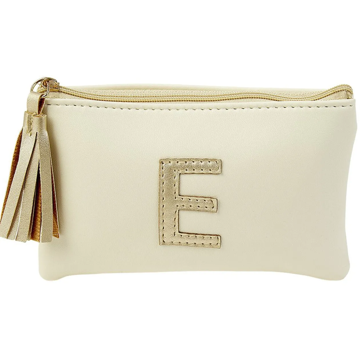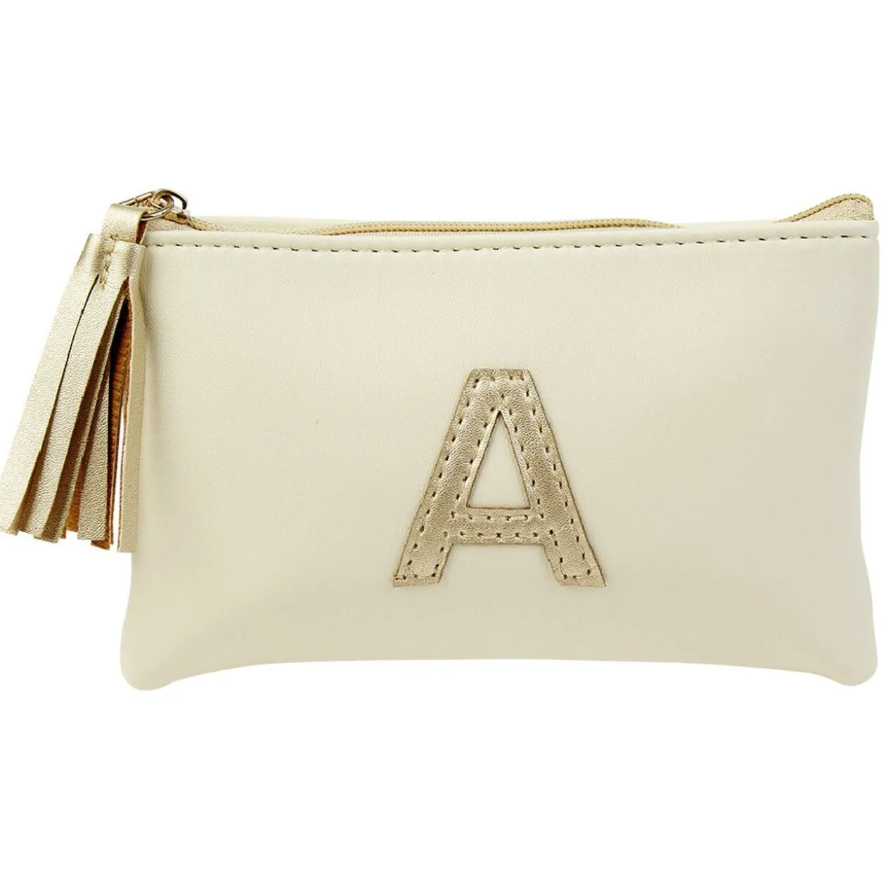 Pochette avec fermeture à glissière petit format décoré d’une lettre dorée.