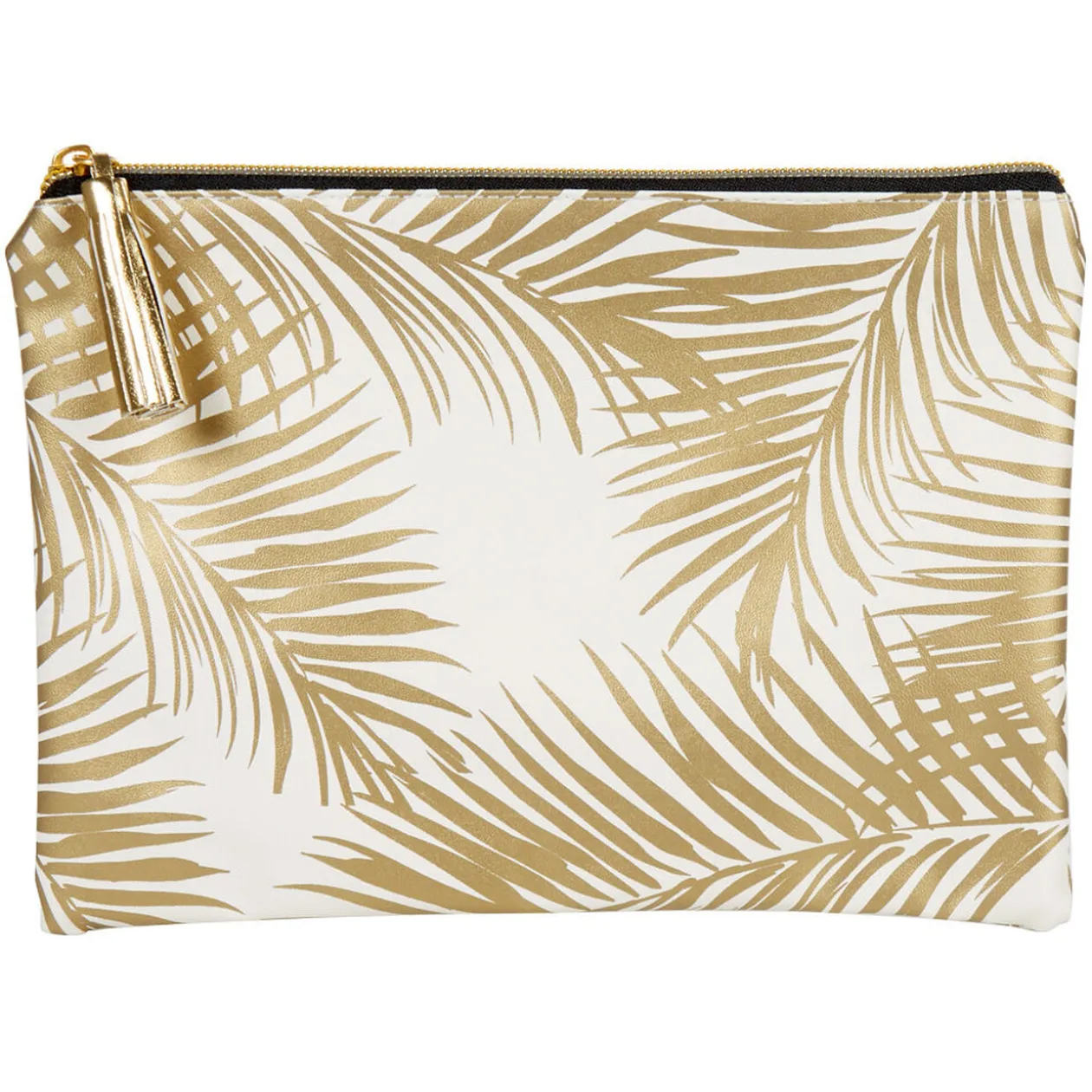 Pochette à maquillage rectangulaire, de couleur crème avec motifs feuillages tropicales dorés.
