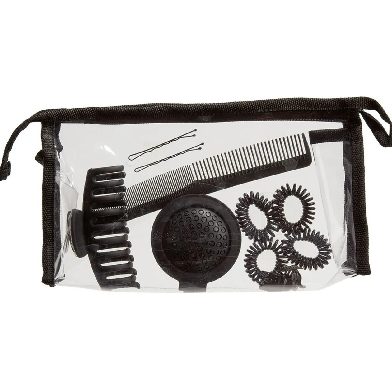 Trousse avec 53 accessoires de coiffure (1 brosse, 1 peigne, 1 pince, 10 pinces crabe, 10 élastiques spirale et 30 pinces guiche).