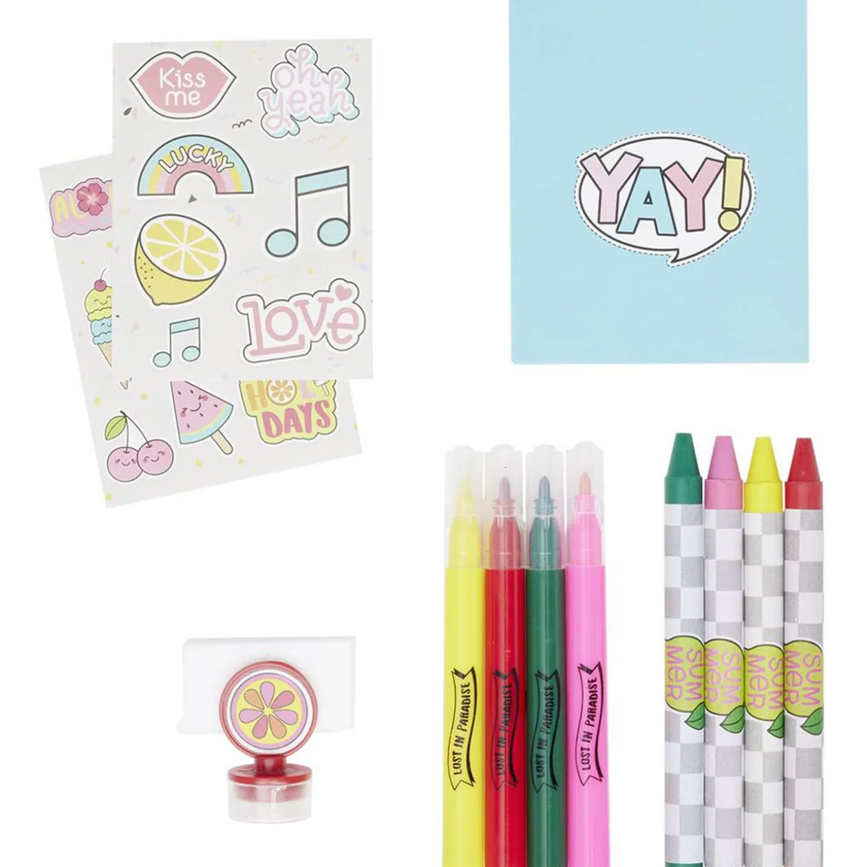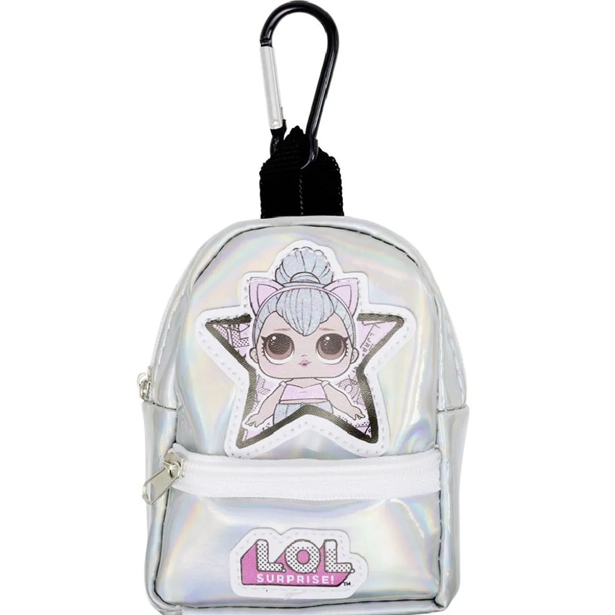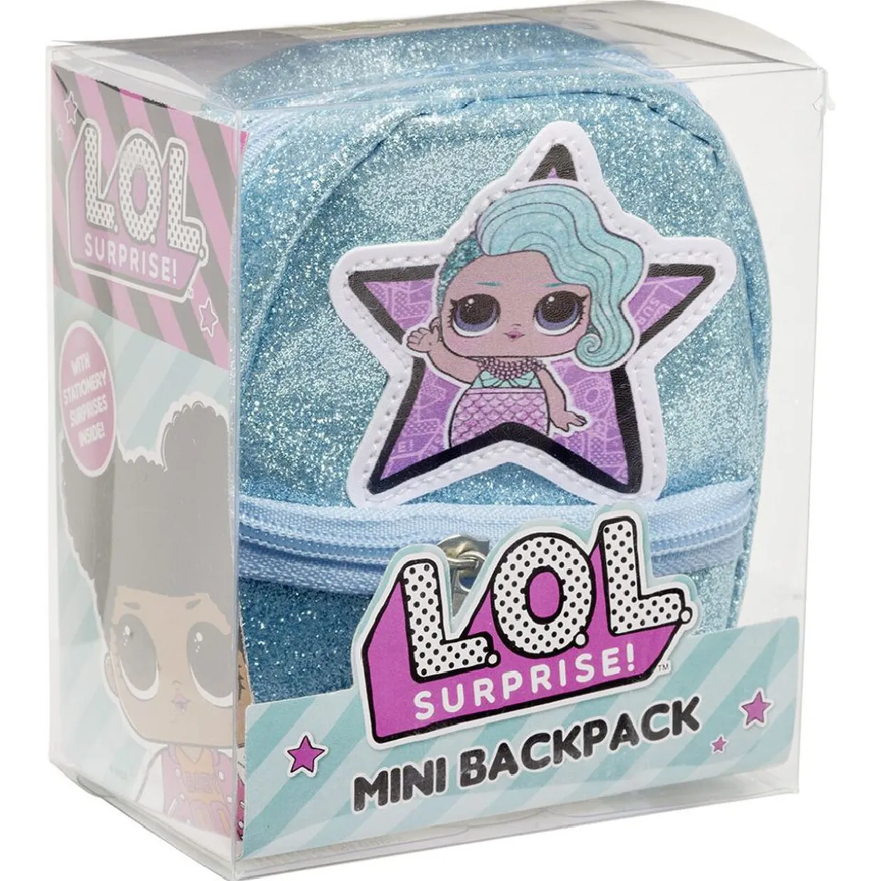 Mini sac à dos LOL Surprise! garni d’accessoires de papeterie : 1 mini crayon HB, 1 mini règle en bois, 1 surligneur en forme de bonbon, 1 pense-bête, 1 gomme et 6 mini crayons de couleur.