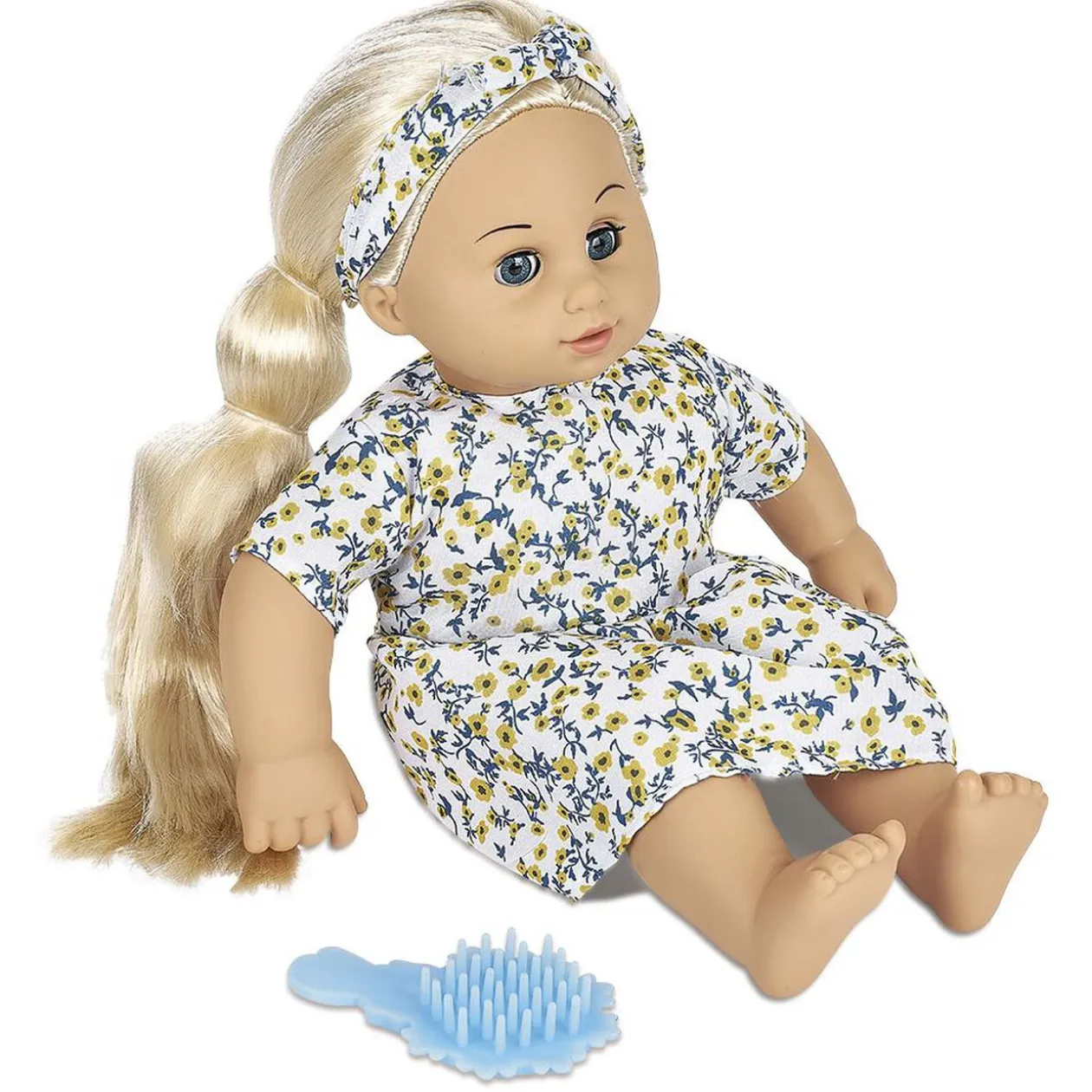 Cette superbe poupée avec longue chevelure à coiffer est livrée avec un peigne et un bandeau assorti à sa jolie robe fleurie.
