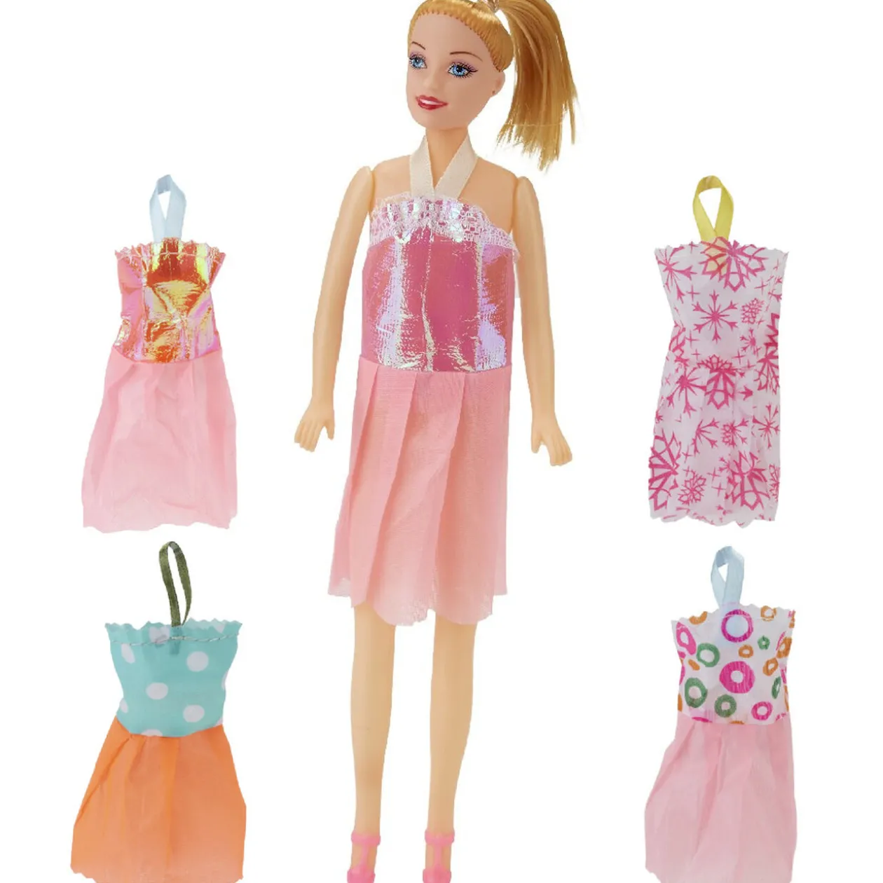 Poupée avec 4 robes de soirée amovibles.