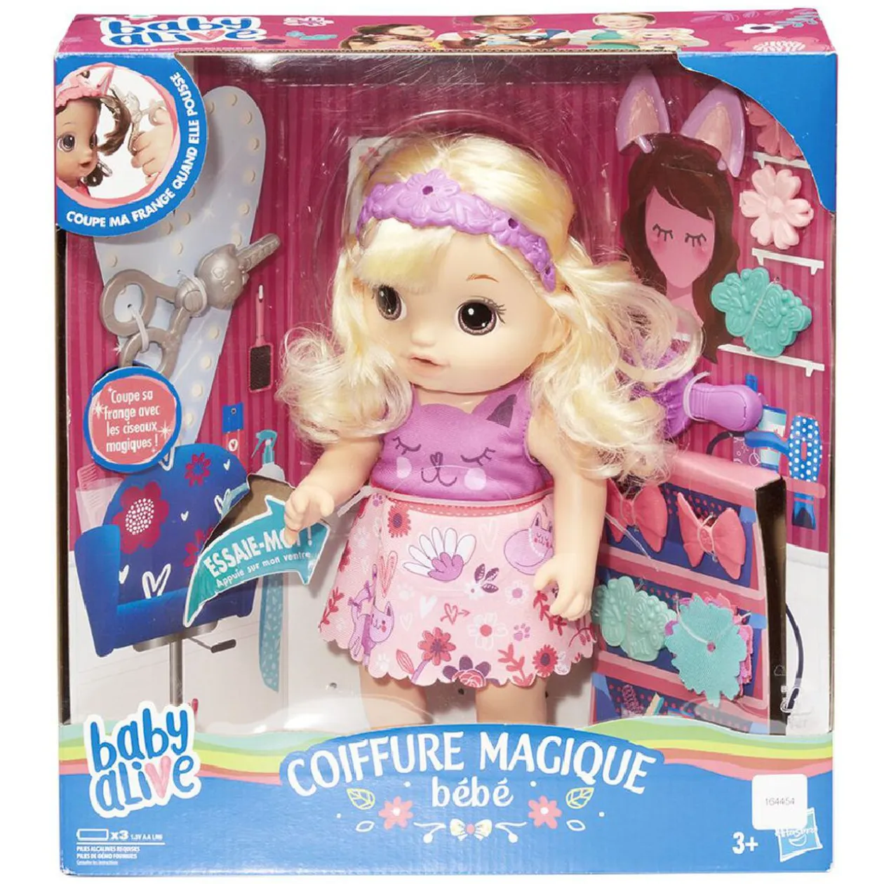 Poupée aux cheveux blonds baby alive avec ses accessoires de coiffure dont un ciseau magique pour couper sa frange.