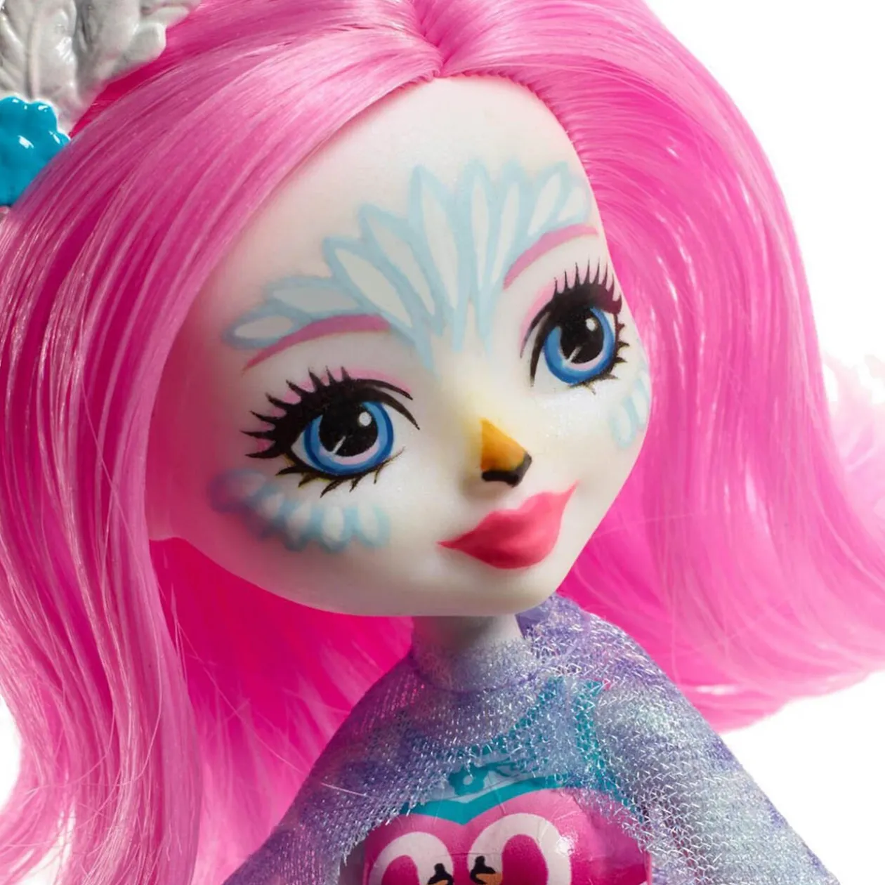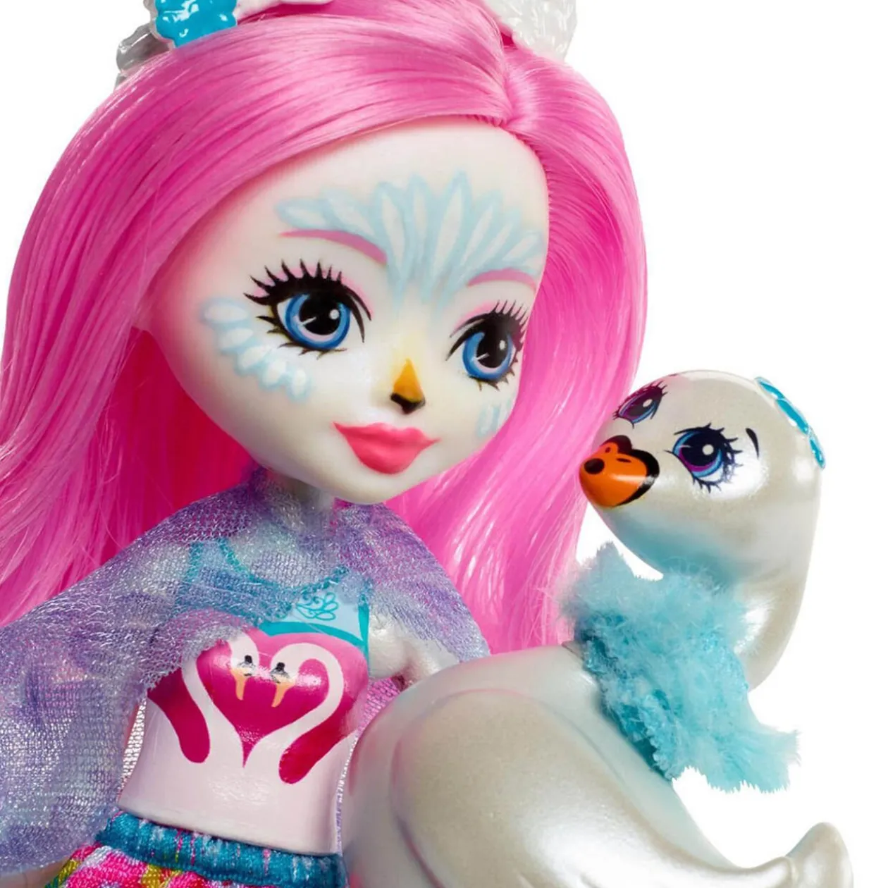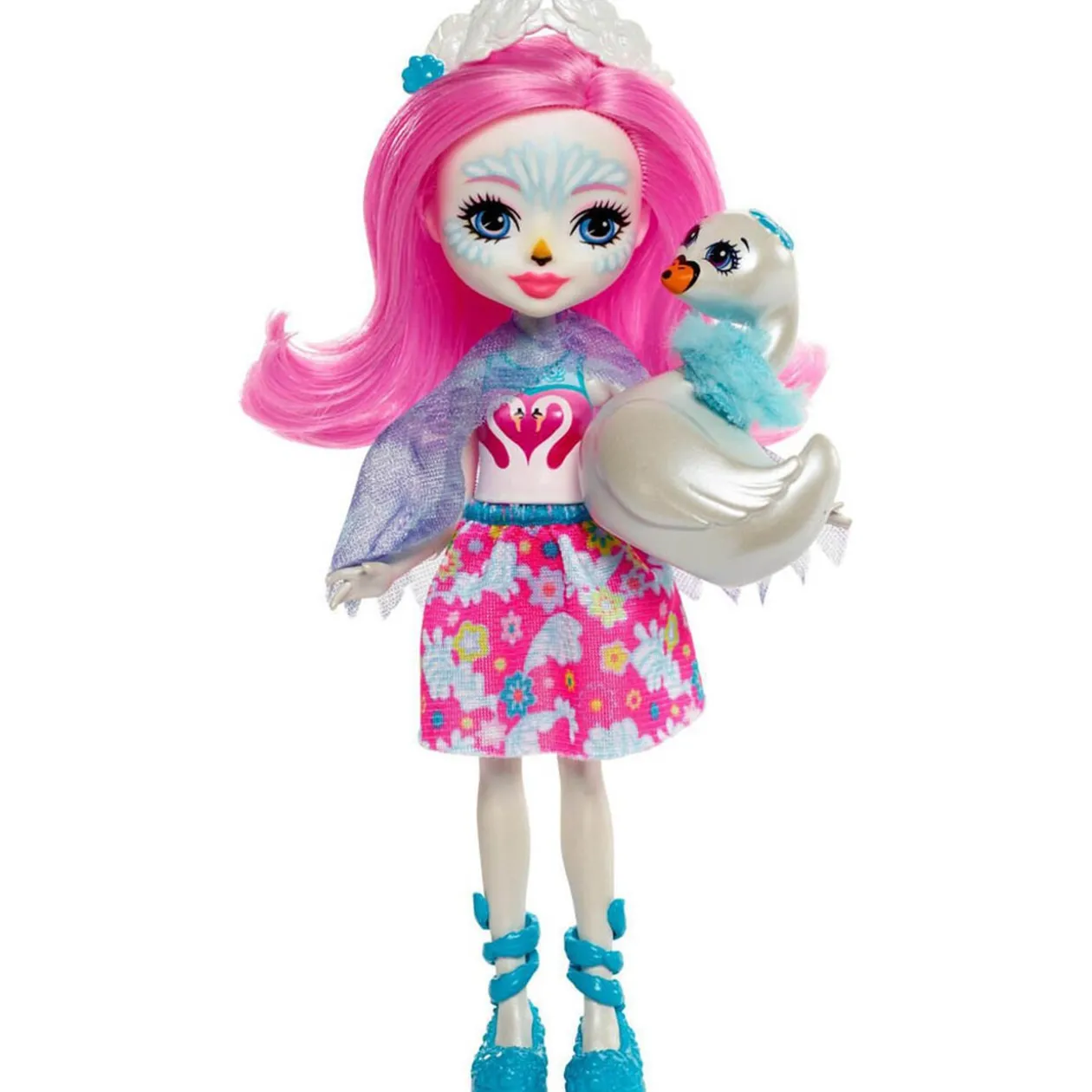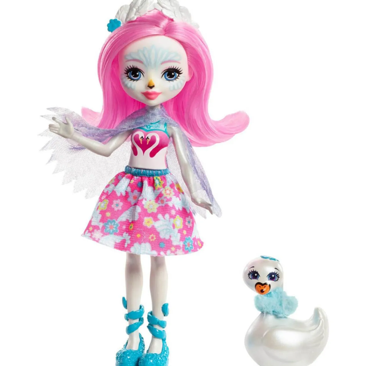 La poupée Saffi Cygne porte une tenue originale composée d’un débardeur rose avec un imprimé cygne en forme de coeur, une jupe motifs fleuris, des ailes bleues et d’élégantes chaussures turquoise. Son superbe maquillage cygne et sa jolie couronne plumes révèlent le lien d’amitié spécial qui la lie à son cygne Poise. Le cygne Poise avec ses magnifiques plumes bleues au cou dévoile une douce et adorable expression !