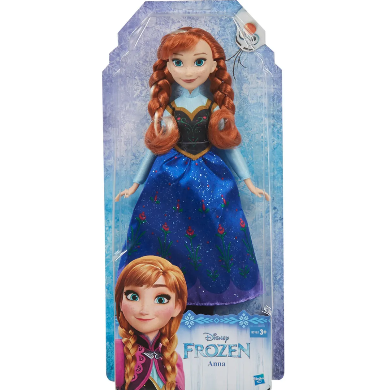 Poupée mannequin La Reine des Neiges Anna de 30 cm de hauteur, robe amovible à tissu pailleté et coloris assorti, plastique.