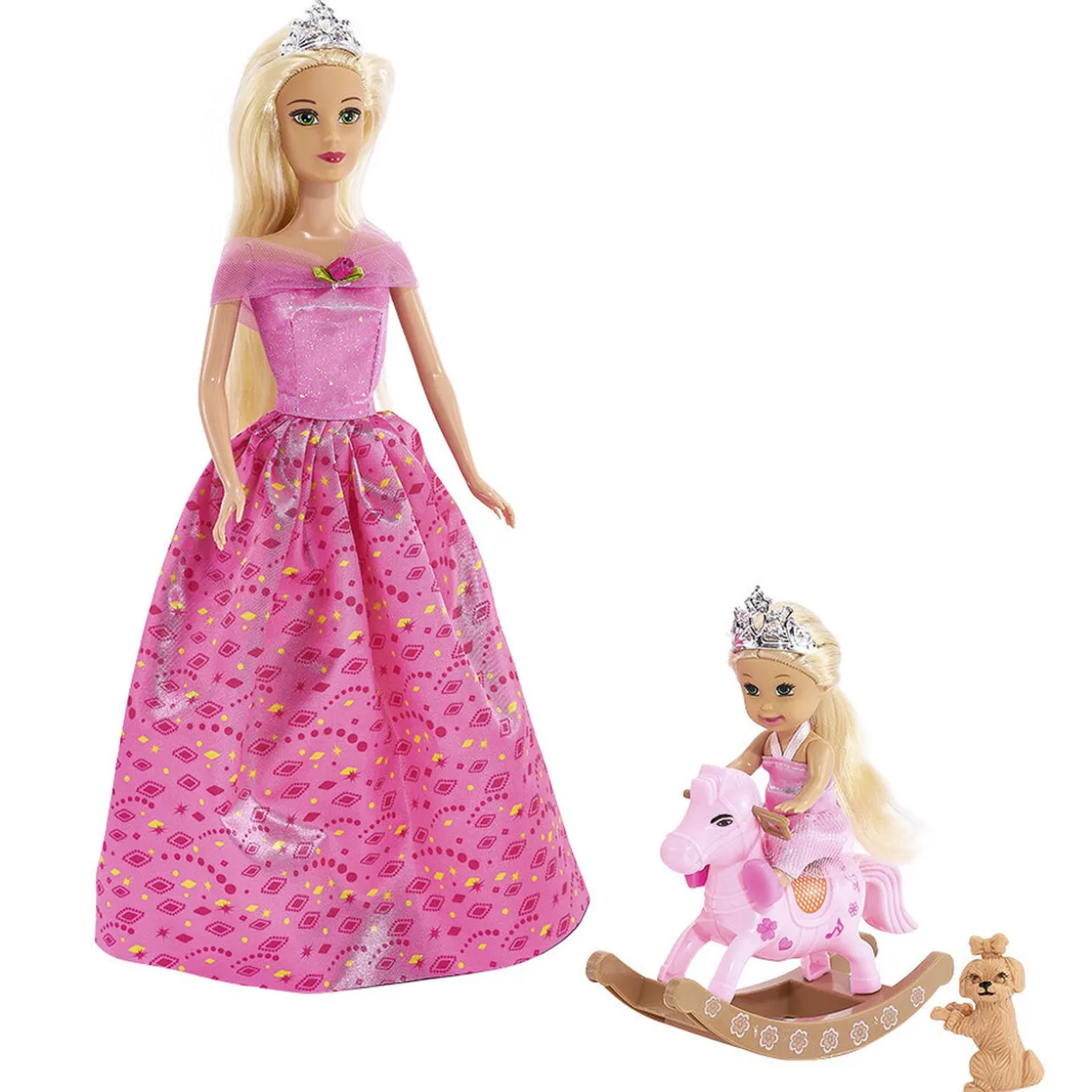Lot de 2 poupées princesses Lina et Mila accompagnées d’un cheval à bascule et d’un petit chien.