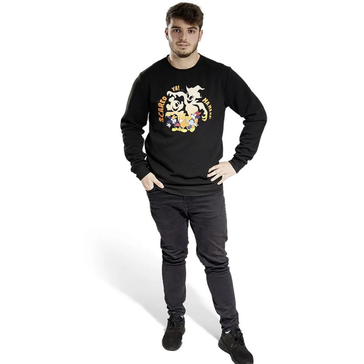 Revêtissez un déguisement discret à l’occasion d’Halloween avec ce pull Disney à motifs Mickey, Minnie et inscriptions « Scared Ya ! Hahaha ! ».