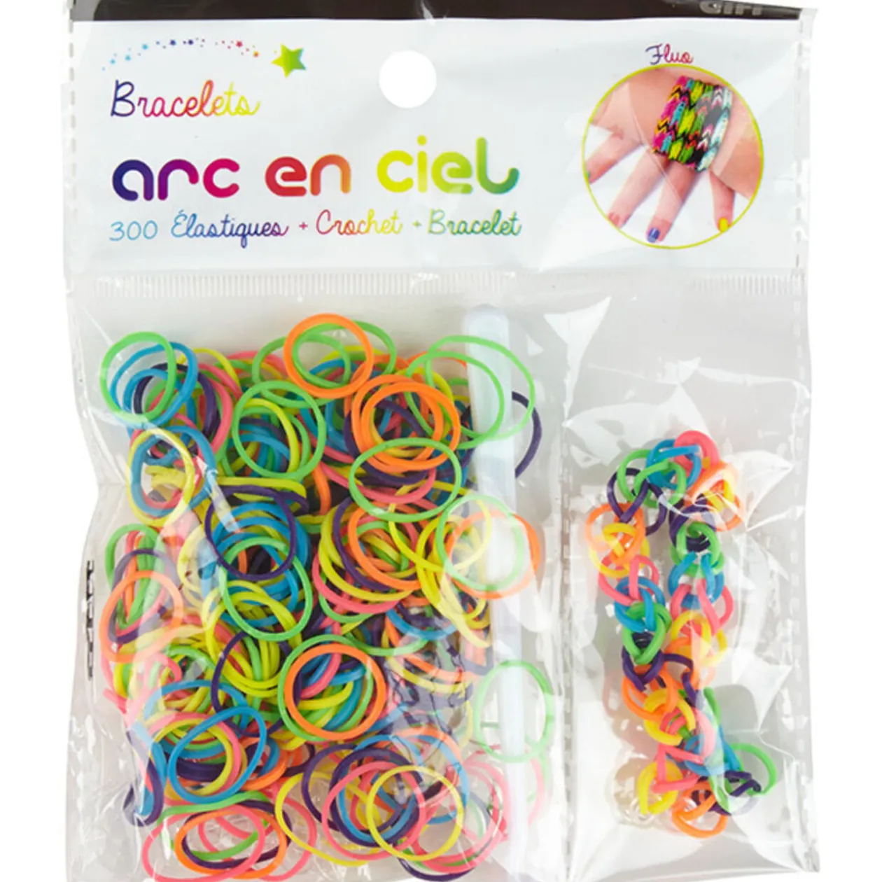 Kit de recharge pour bracelets Arc en ciel comprenant : 300 élastiques Fluo (rose, bleu, violet, vert, jaune, orange) + 1 crochet + des fermoirs + 1 bracelet.