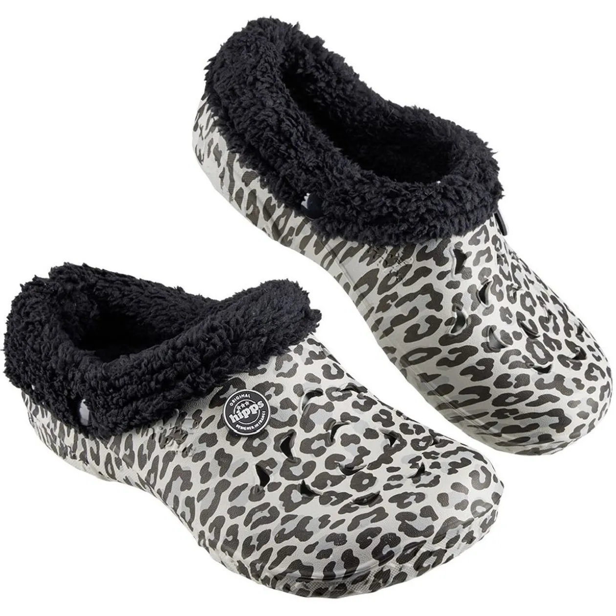 Paire de sabot Hipps avec imprimé léopard noir et blanc. Fourrés à l’intérieur pour l’hiver et déclipsable pour l’été.