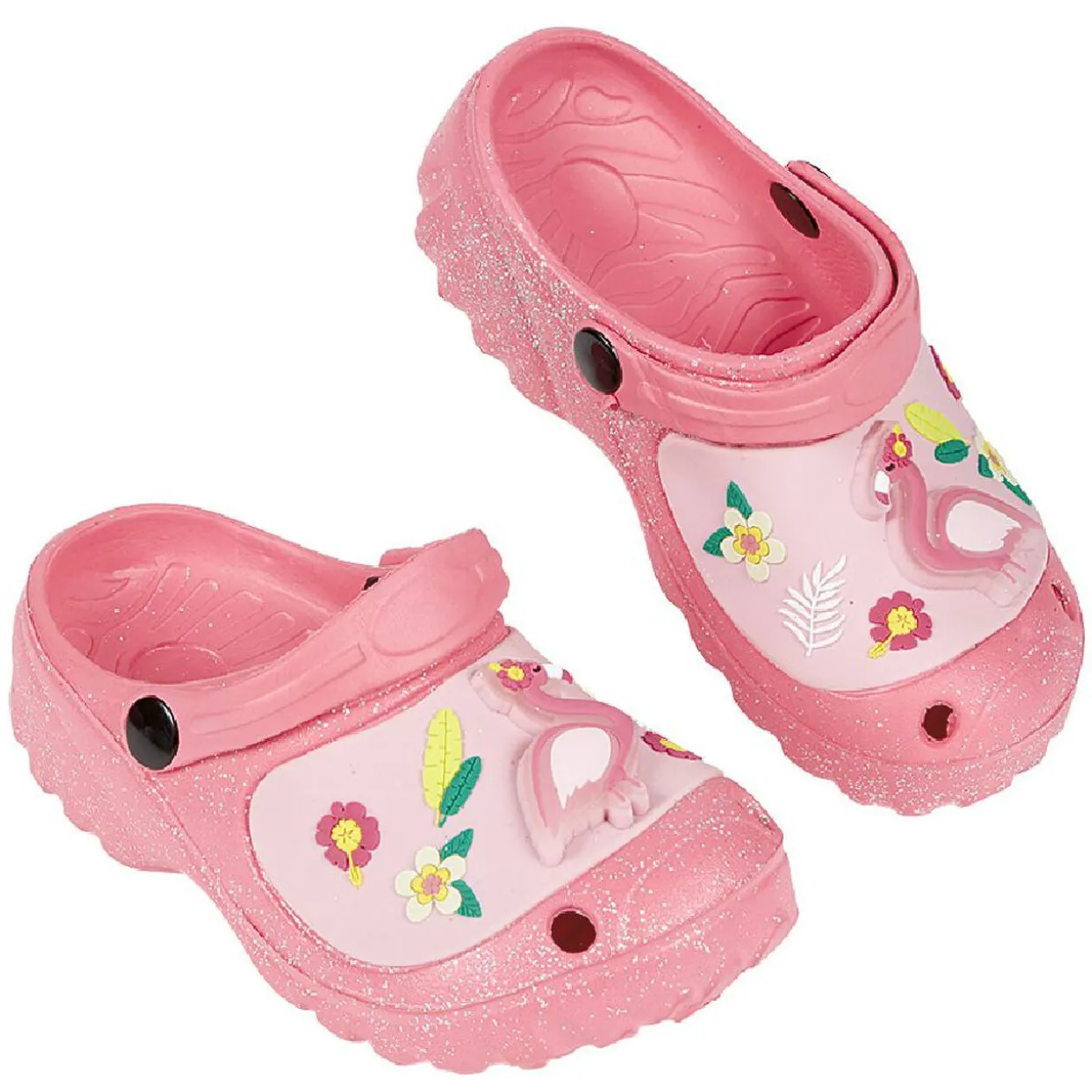 Sabot lumineux rose pailleté avec flamant rose et fleurs.