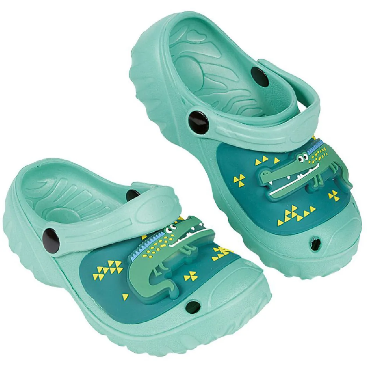 Sabot lumineux vert avec crocodile et triangles jaunes.