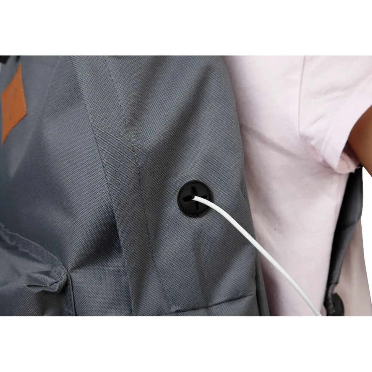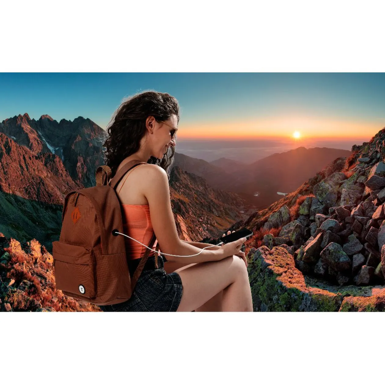 Sac à dos avec batterie nomade 2800mAh intégré, 2 compartiments zippés, bretelles et dos matelassés.