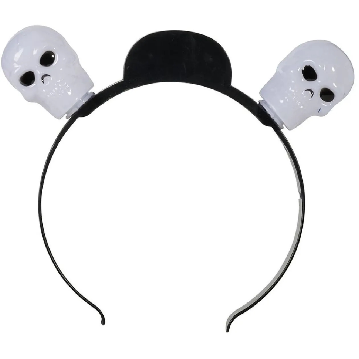 Serre-tête noir avec 2 crânes blancs lumineux, idéal pour Halloween.
