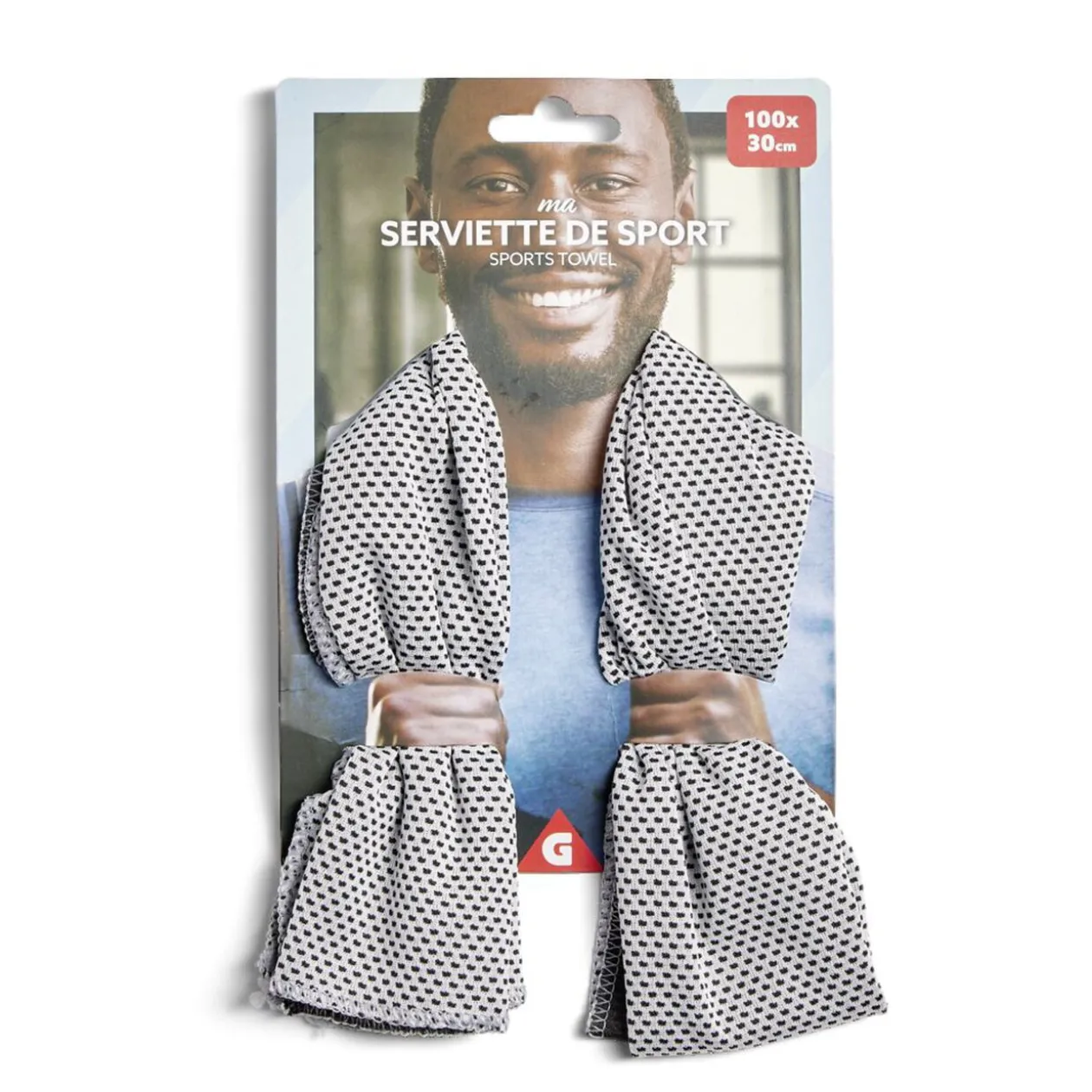 Cette serviette de sport en polyester gris, mesurant 100×30 cm, offre un équilibre parfait entre style et fonctionnalité.