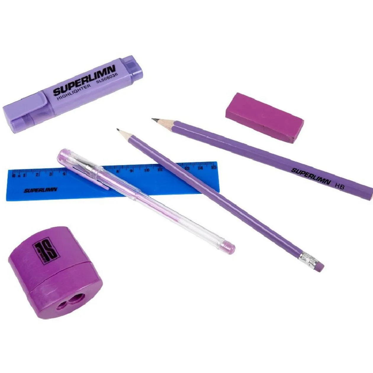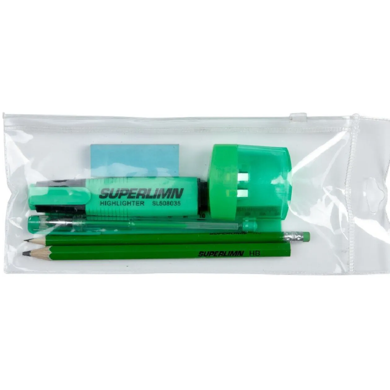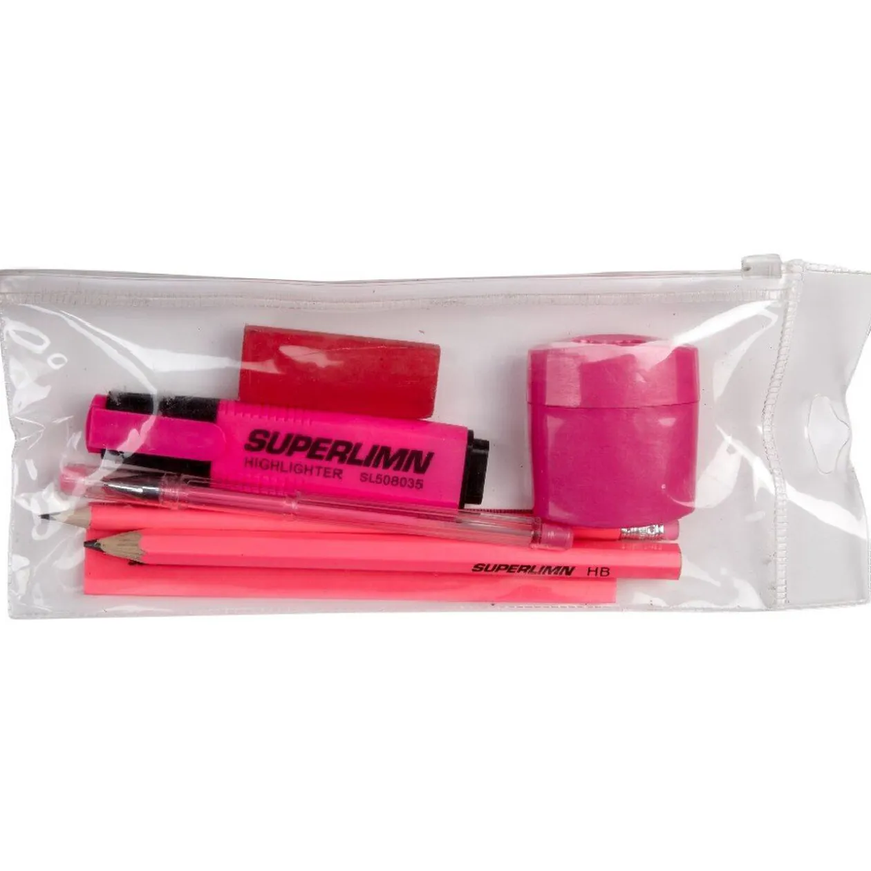Trousse transparente comprenant 2 crayons à papier,1 stylo gel, 1 surligneur, 1 règle, 1 gomme et 1 taille-crayon.
