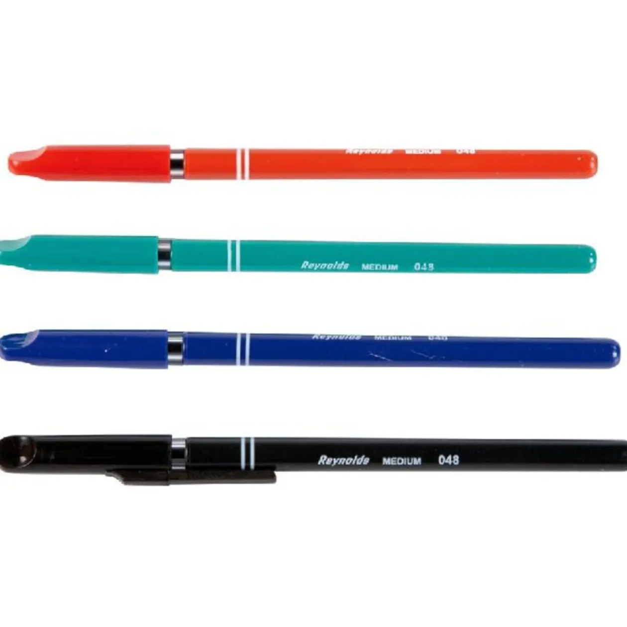 4 stylos billes « Reynolds », pointe médium, couleur : 1 rouge, 1 vert, 1 bleu et 1 noir.