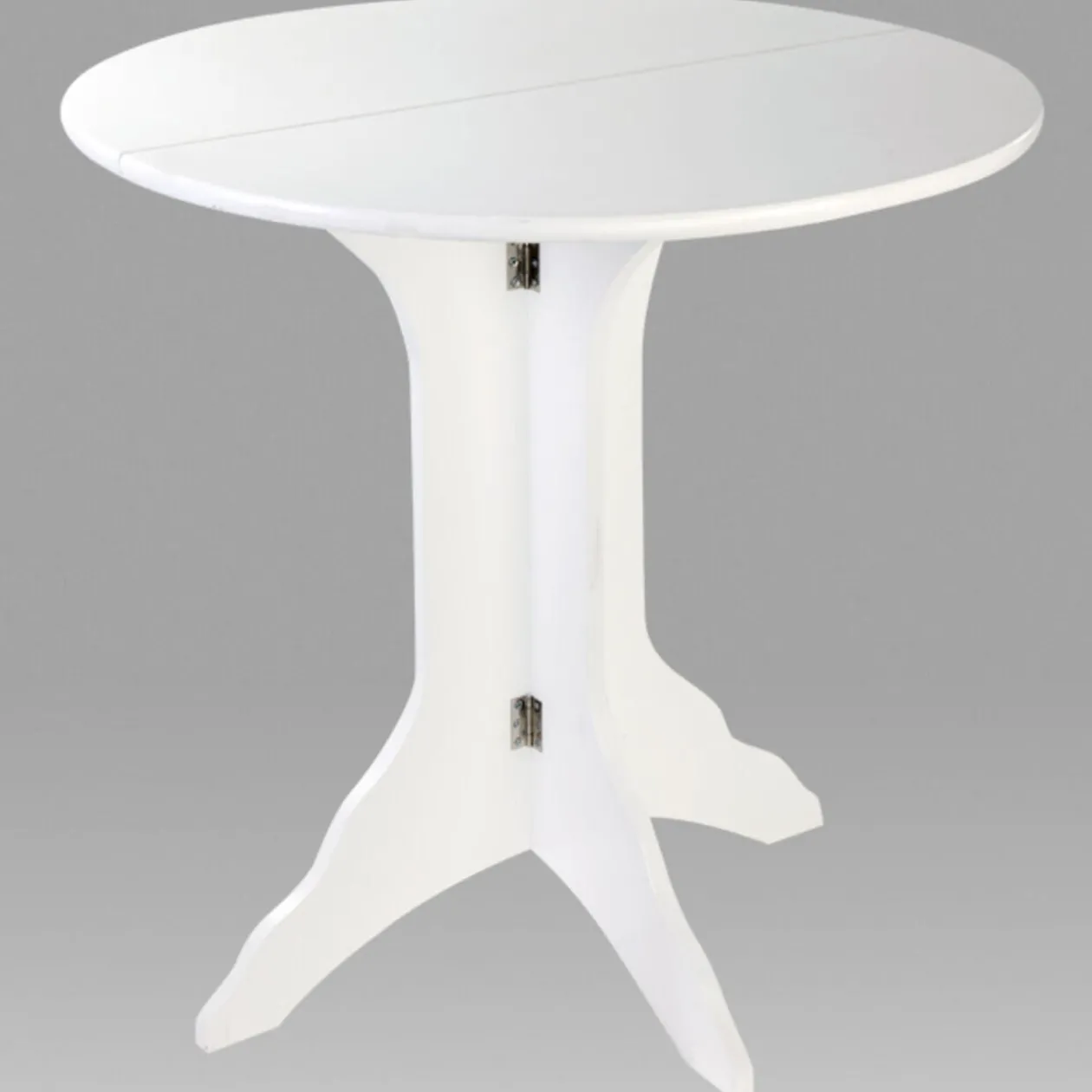 Table pliante blanche, Ø 75 cm, h. 76 cm, MDF (panneau de fibres de bois), finition vernis nitrocellulosique.