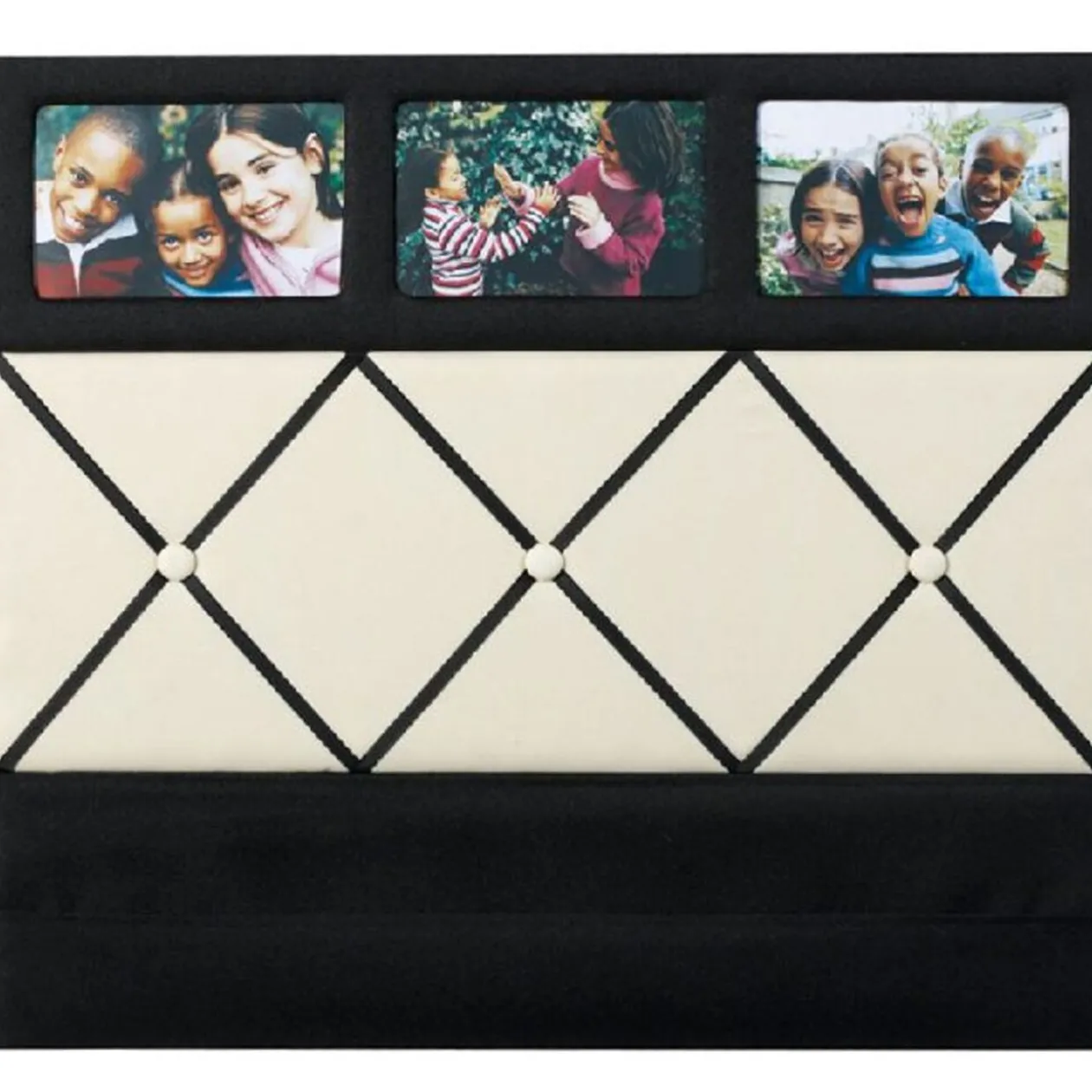 Tableau pense-bête en plastique qui peut accueillir 3 photos d’une dimension de 14×9 cm. Les rubans retiennent les objets en place. Il présente deux niches en tissu pour y glisser ce que vous voulez : des accessoires de bureau ou des stylos par exemple. Dim. 50,5×45 cm.Tous les objets de décoration sont chez GIFI.