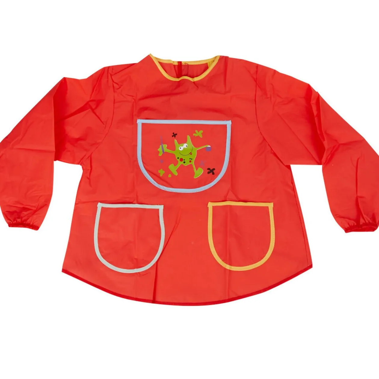 Tablier rouge pour enfant avec manches, motif petit monstre vert, dim. 50×140 cm, polyester.