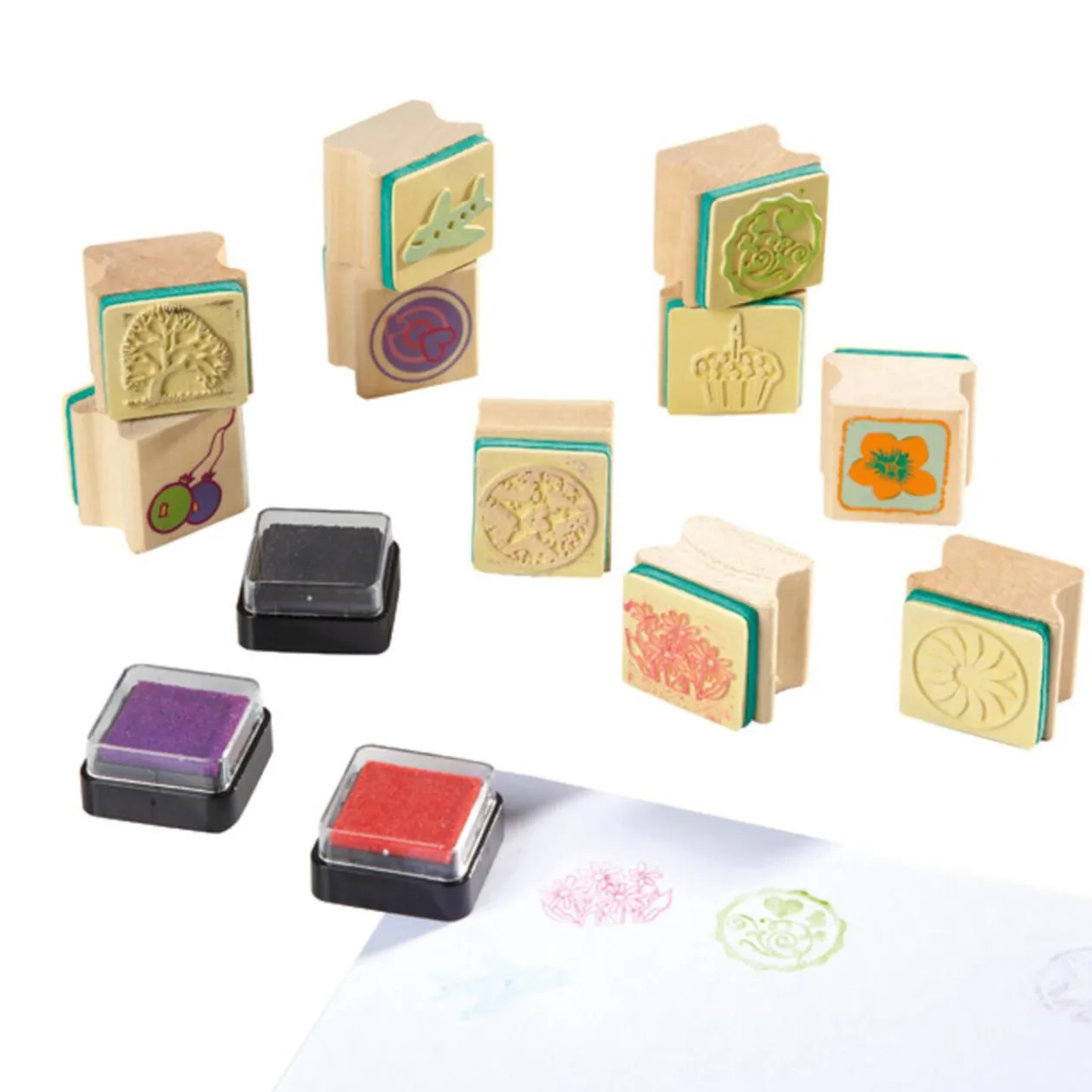 Comprend : 10 tampons en bois de modèles différents (fleur, fête, love…) et 3 encreurs de couleurs violet, rouge et noir. Dès 3 ans.