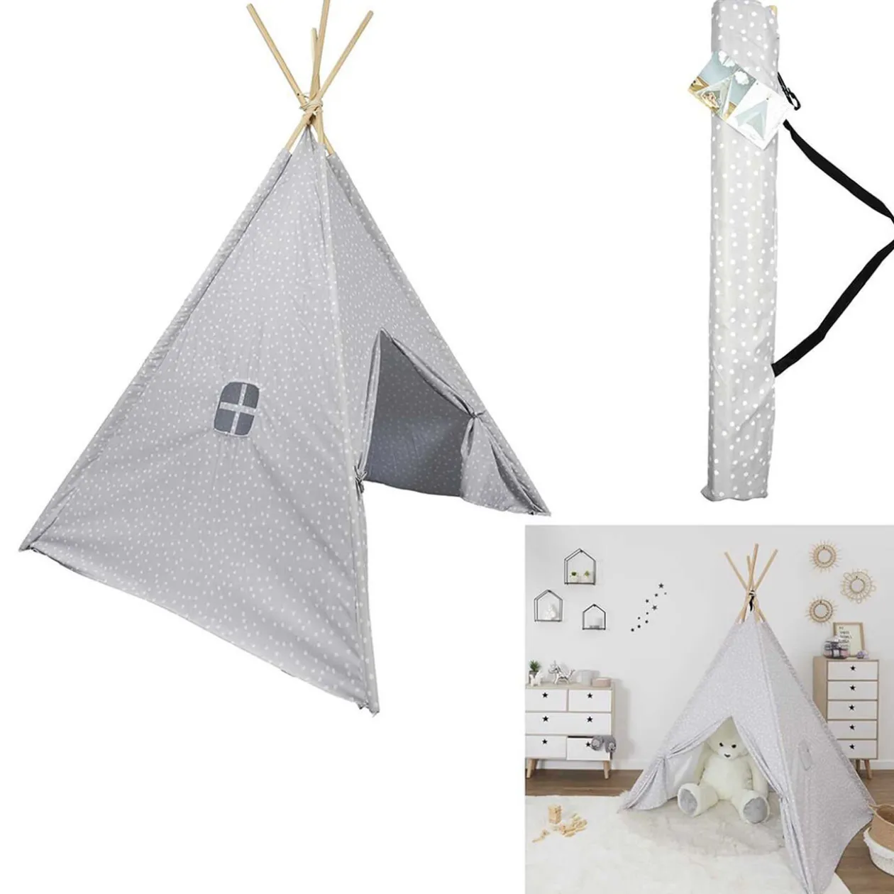 Décoratif et ludique, votre enfant adorera se réfugier dans ce tipi gris à motifs pois blancs pour se créer un monde merveilleux dont lui seul a le secret !