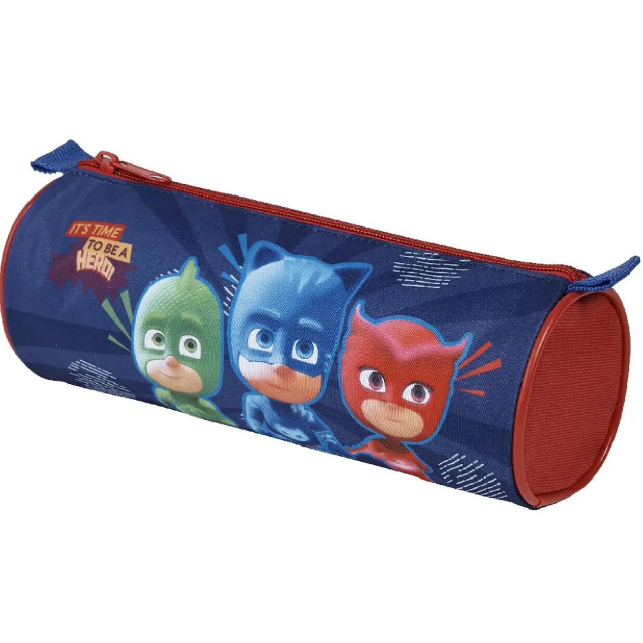 Trousse cylindrique en polyester imprimé Pyjamasques avec fermeture à glissière sur le dessus.