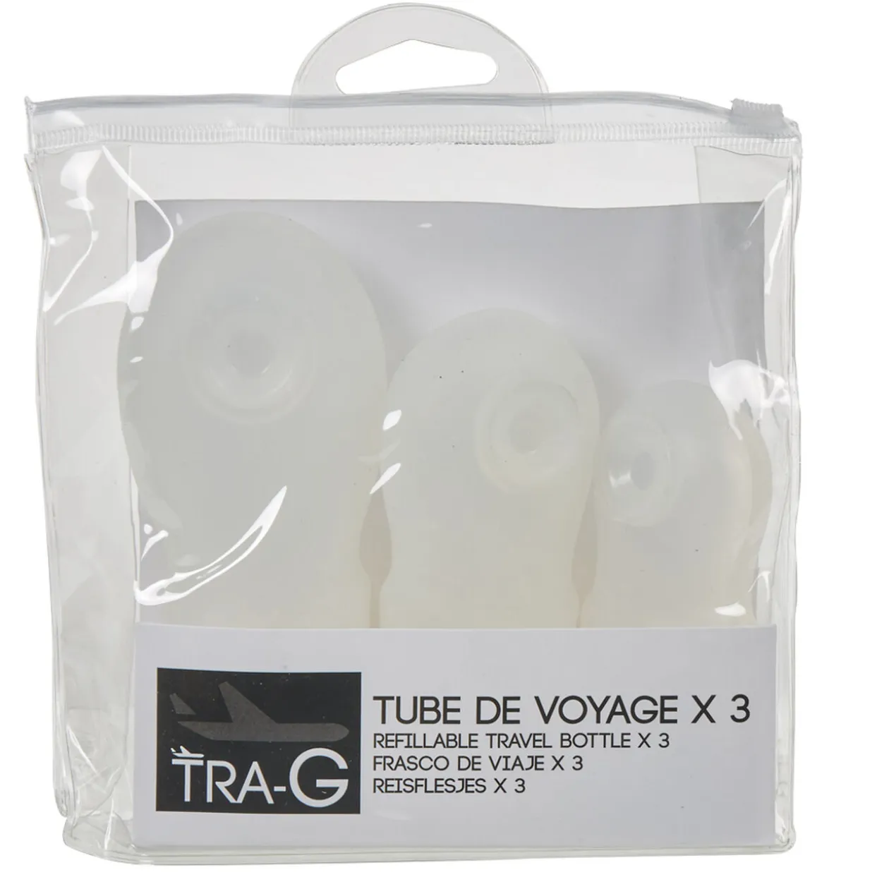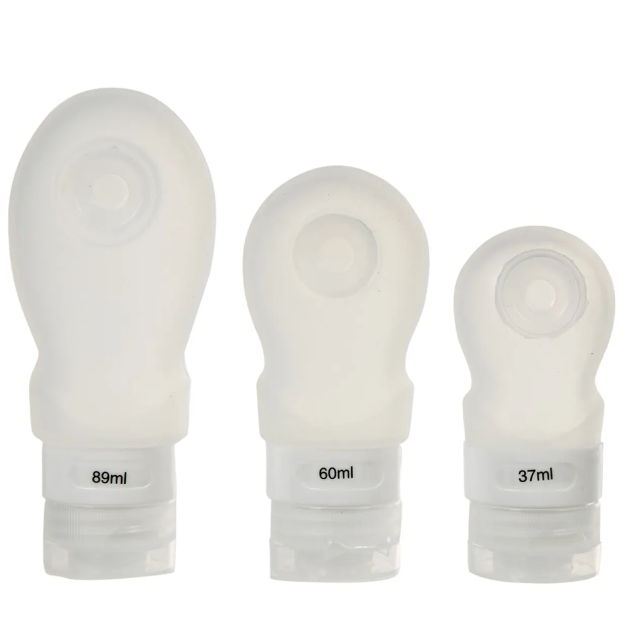Set de 3 tubes de voyage en silicone d’une contenance de 37, 60 et 89 ml.