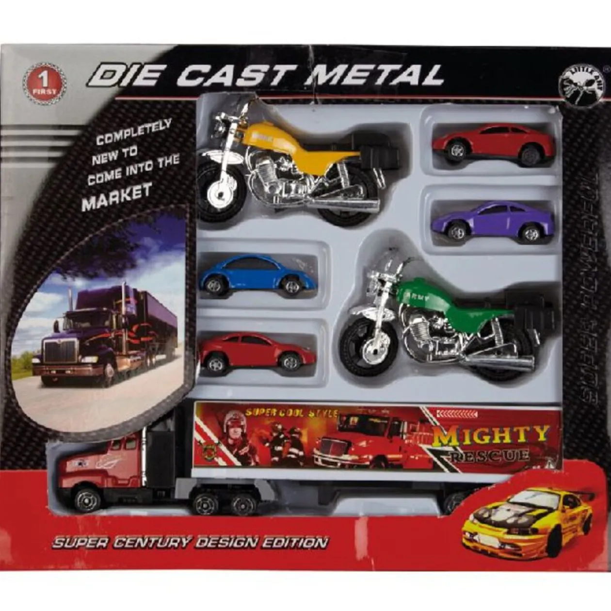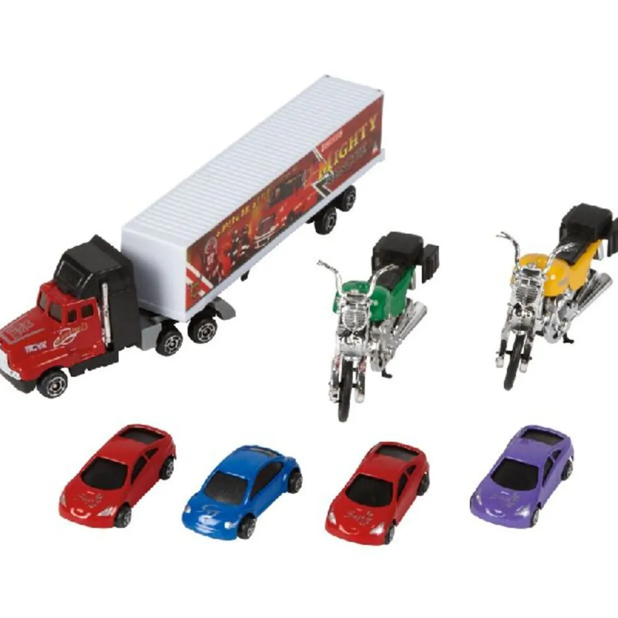 Comprend : 1 camion, 4 petites voitures et 2 motos, dès 3 ans.