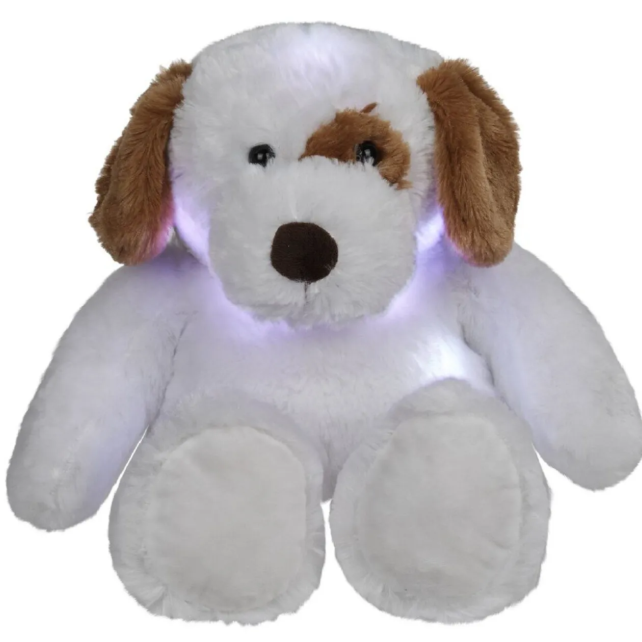 Peluche chien assis blanc et marron lumineux. Peut servir de veilleuse.