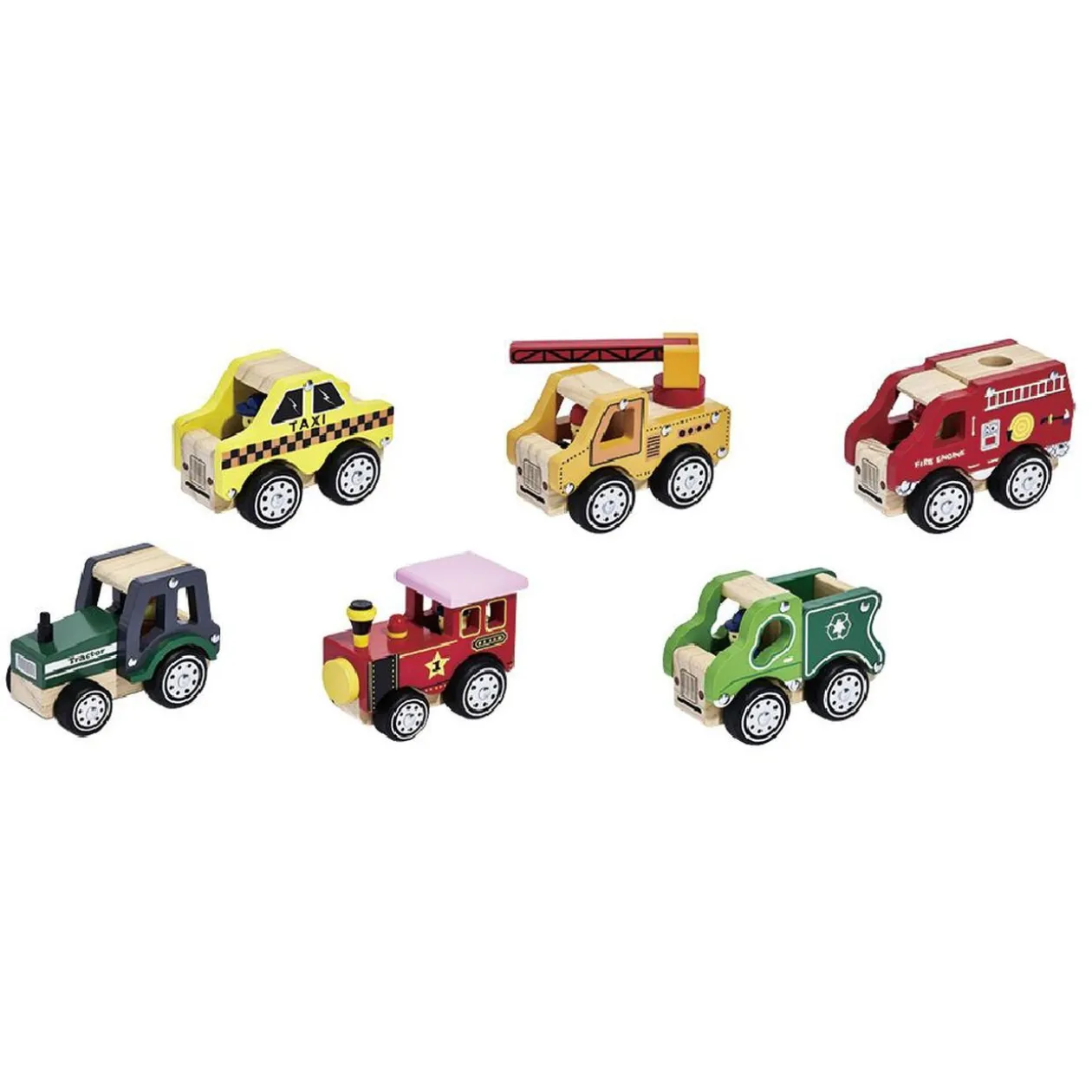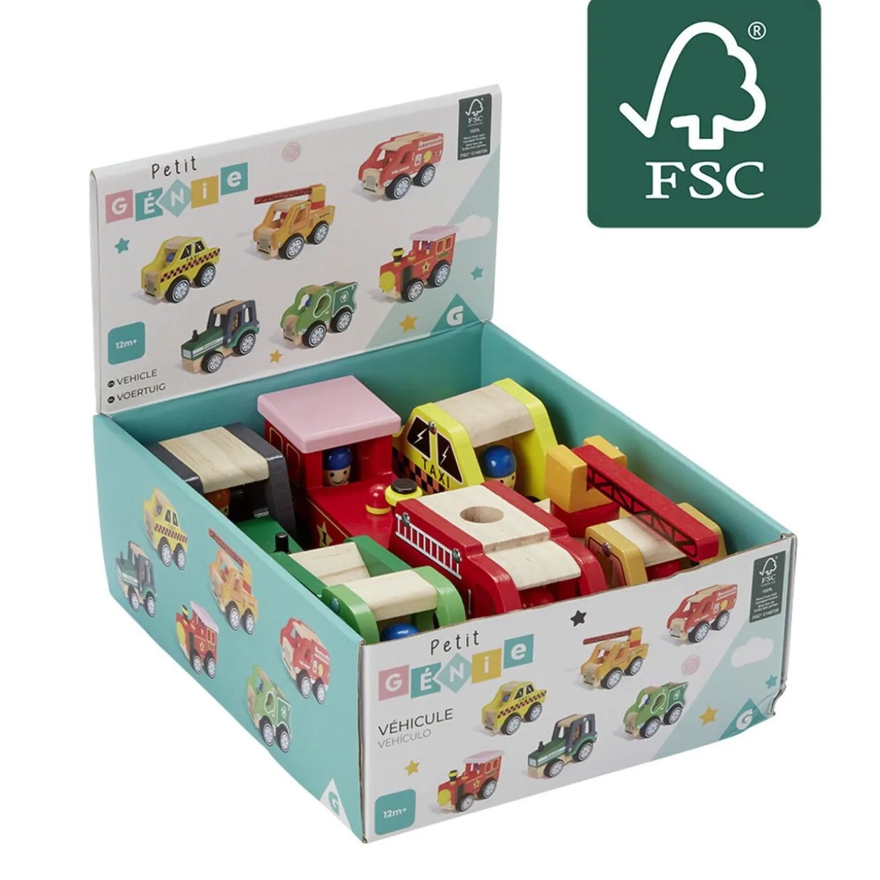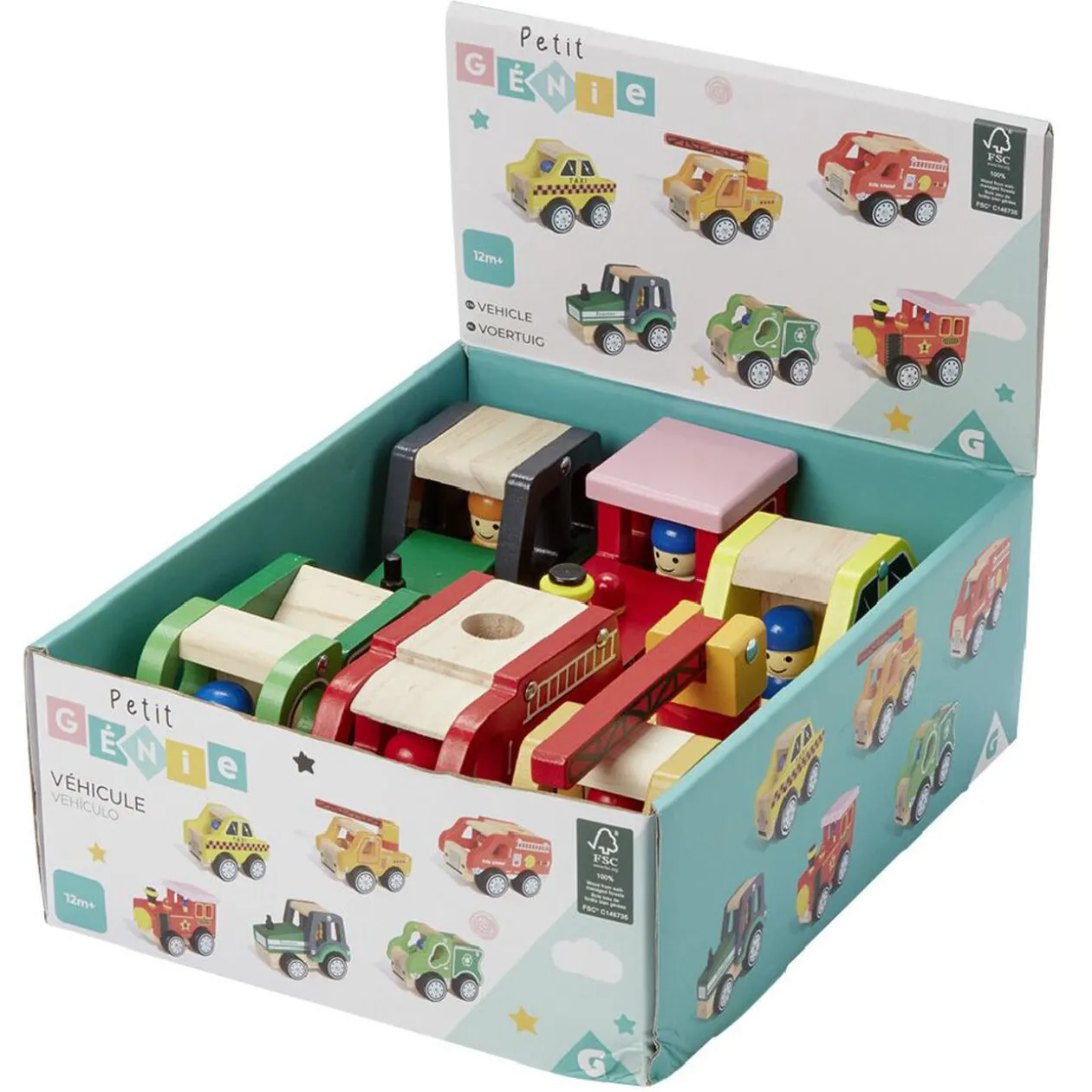 Voiture en bois multicolore en forme de taxi, de camion de pompier, de camion poubelle, de tracteur, de locomotive ou de camion de chantier.