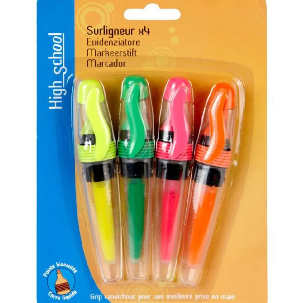4 stylos surligneurs, avec pointe biseautée, encre liquide et grip caoutchouc.