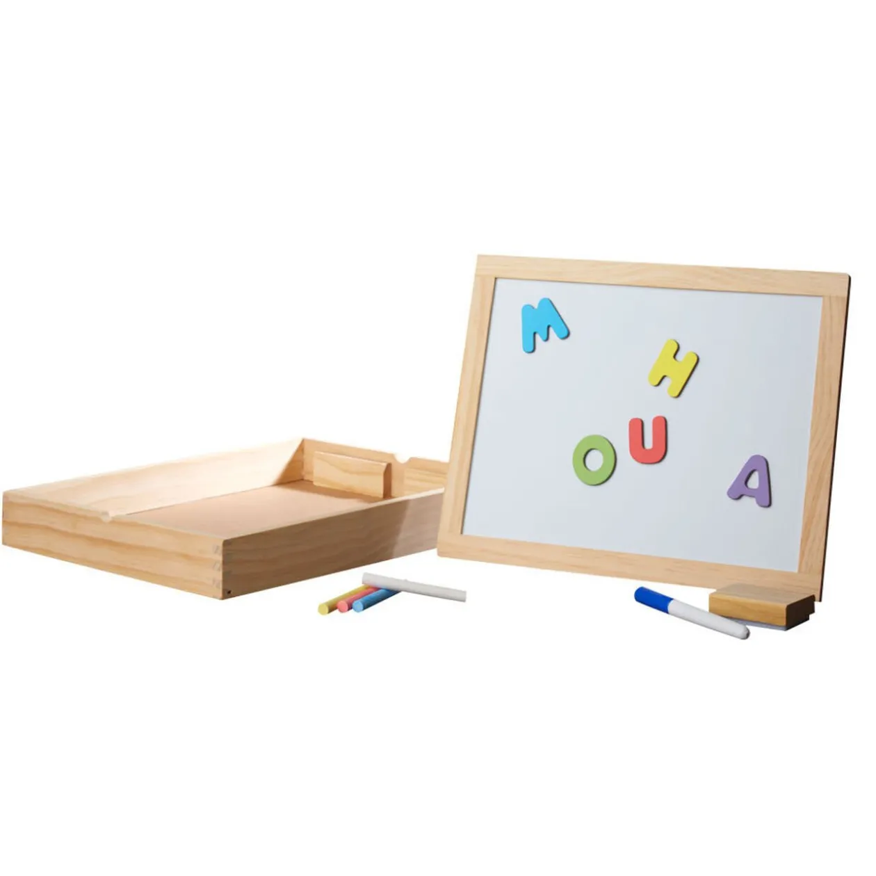 Comprend des lettres magnétiques, craies et marqueur, effaceur à ardoise et casier de rangement.