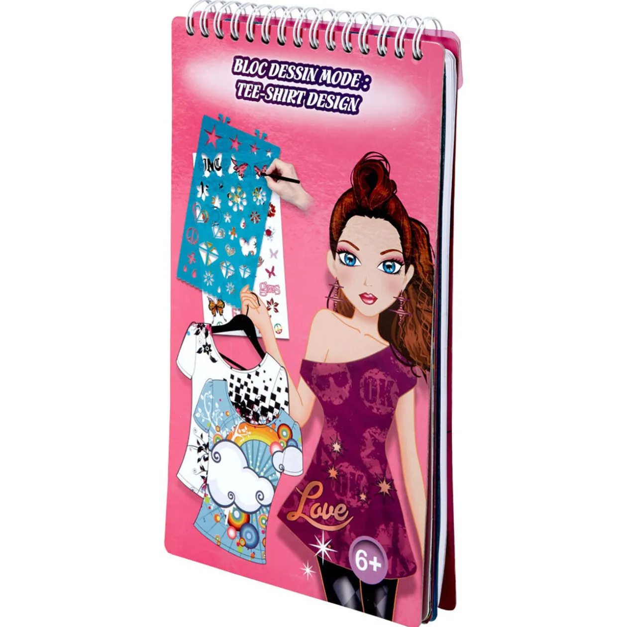 Bloc dessin mode tee-shirt designcomprenant 36 pages de dessin, 3 feuilles d’autocollants, 5 pochoirs et 2 instructions.