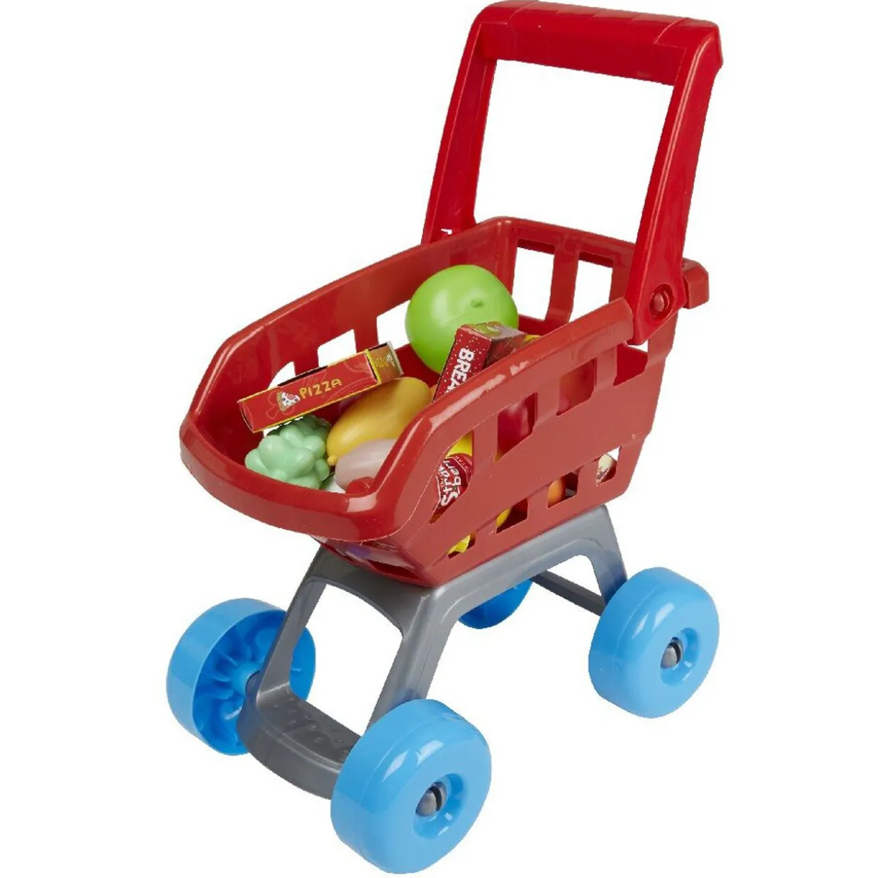 Ce chariot de course garni comprend 18 accessoires imitant parfaitement les provisions du quotidien: jus, pâtisseries, pizzas, hamburgers sans oublier des légumes et fruits pour des repas parfaitement équilibrés!