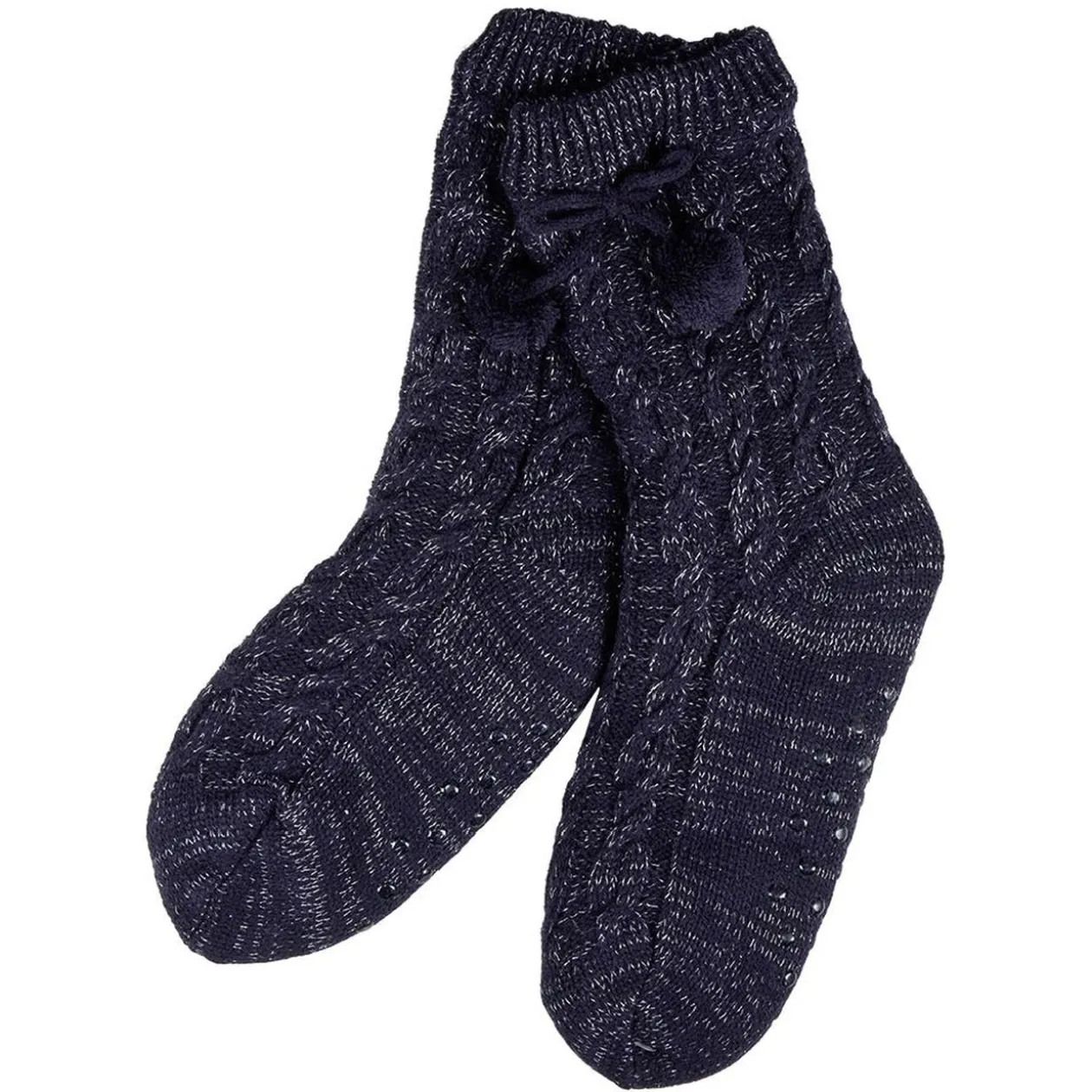 Paire de chaussettes chaudes épaisses de couleur noire avec pompons fantaisies et intérieur fourré blanc.