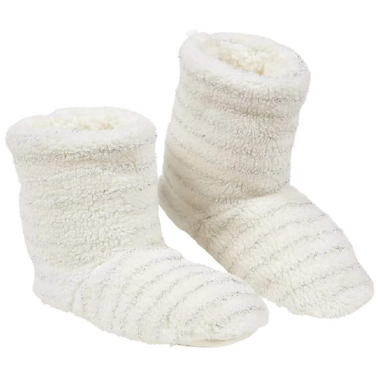 Paire de bottes d’intérieur en polyester blanc rayé gris argenté.