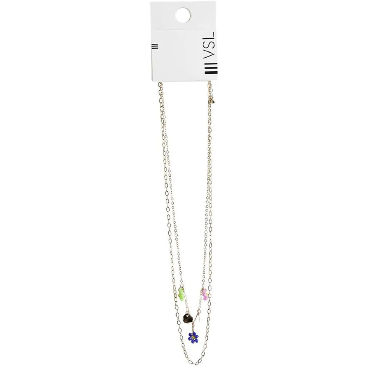 Ce collier à deux rangs est orné de pampilles dorées et de fleurs colorées, créant un accessoire qui allie l’éclat du doré à la fraîcheur des teintes vives.