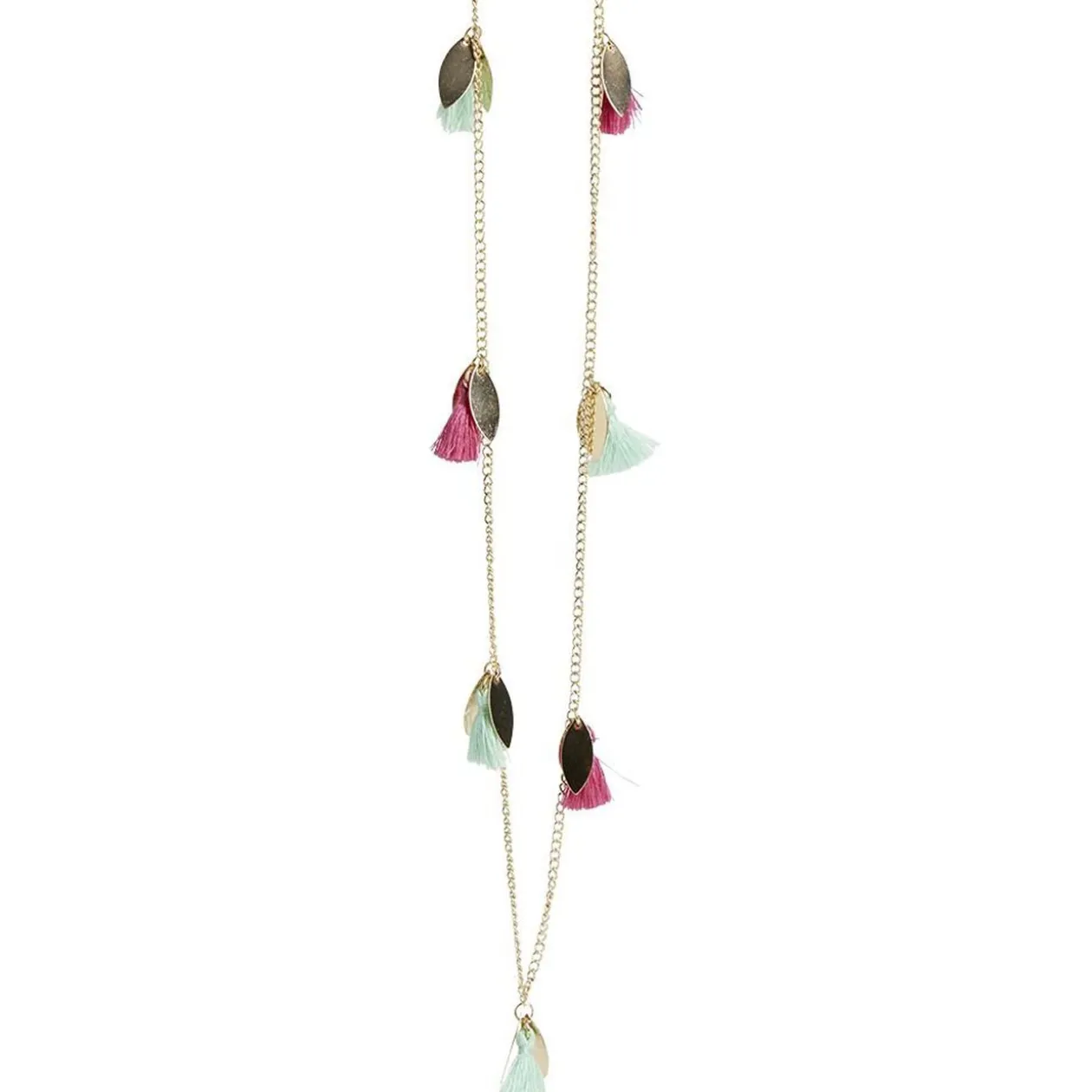 Ce collier à chaîne est agrémenté de pampilles dorées ainsi que de pompons bleus et roses.