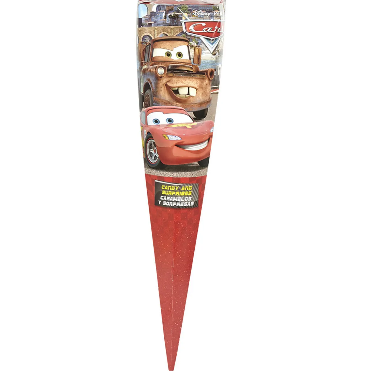 Cône surprise Cars, dim. 12x9x53 cm, carton, cont. 10 gr. Contient des bonbons et des surprises.