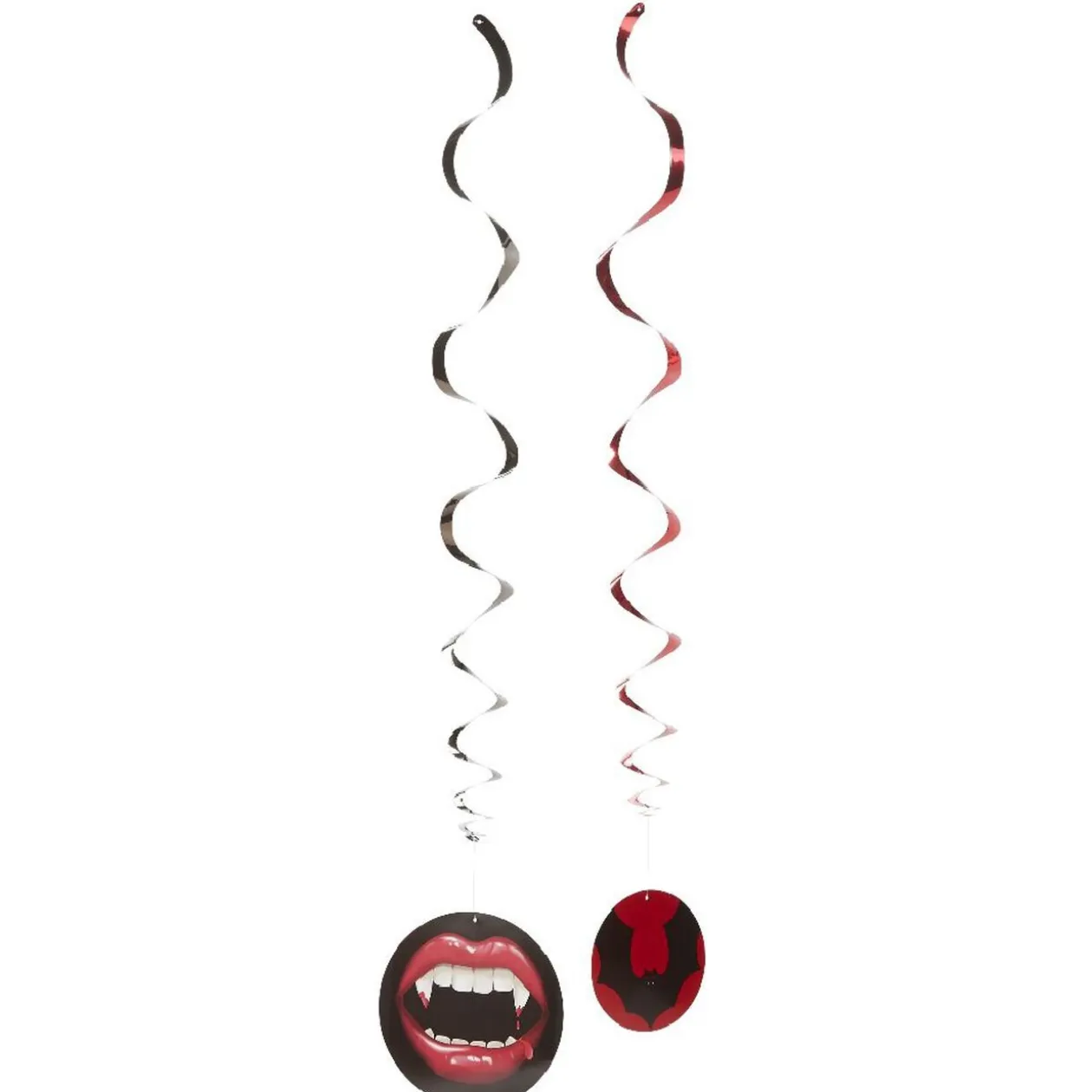 12 suspensions pour décoration d’Halloween : des bouches de vampire, des chauve-souris et des spirales.