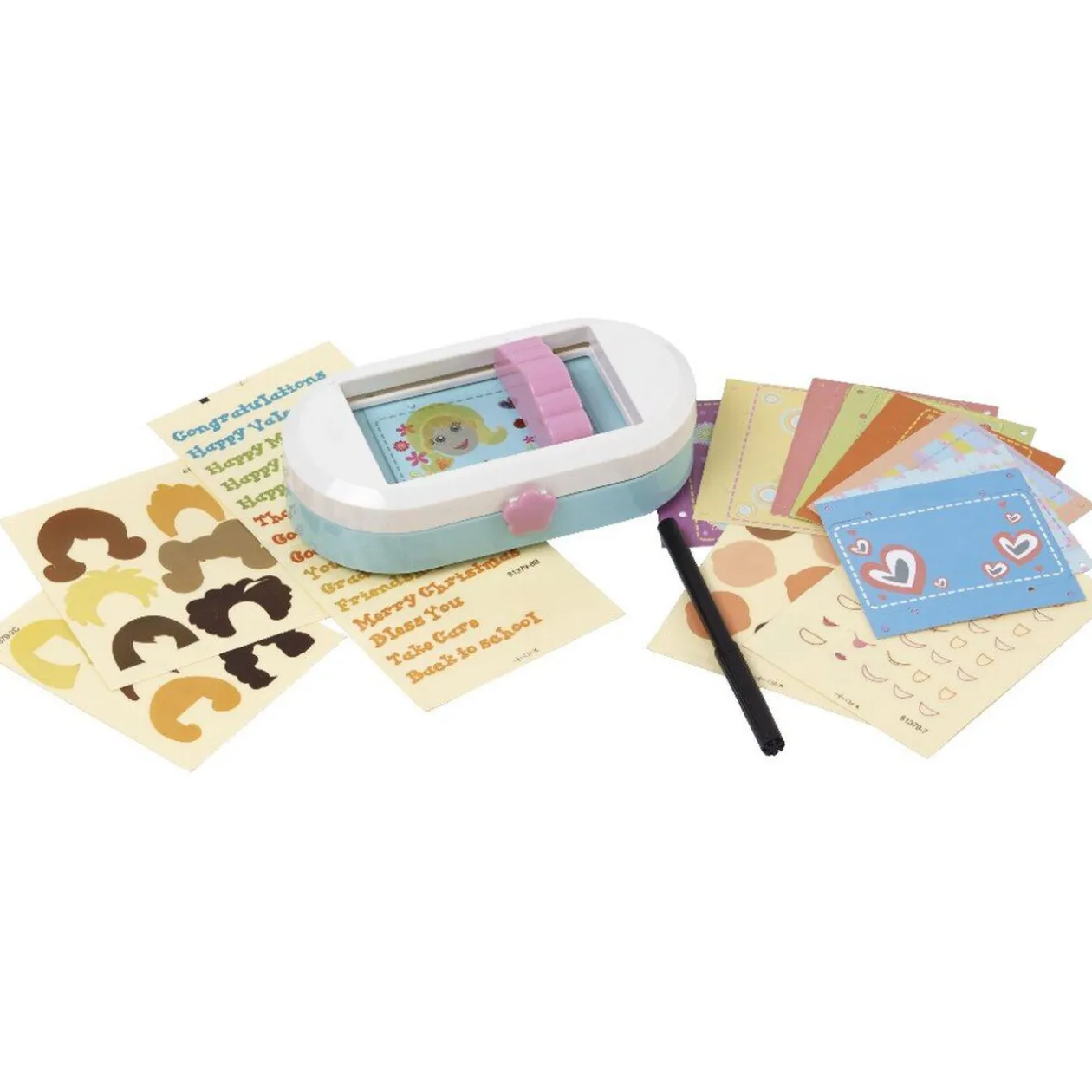 Fabrique de cartes postales comprenant également 12 cartes avec fond au choix, 12 transparents adhésifs, nombreux stickers visages, stickers pour décorer, 1 feutre et 1 notice.