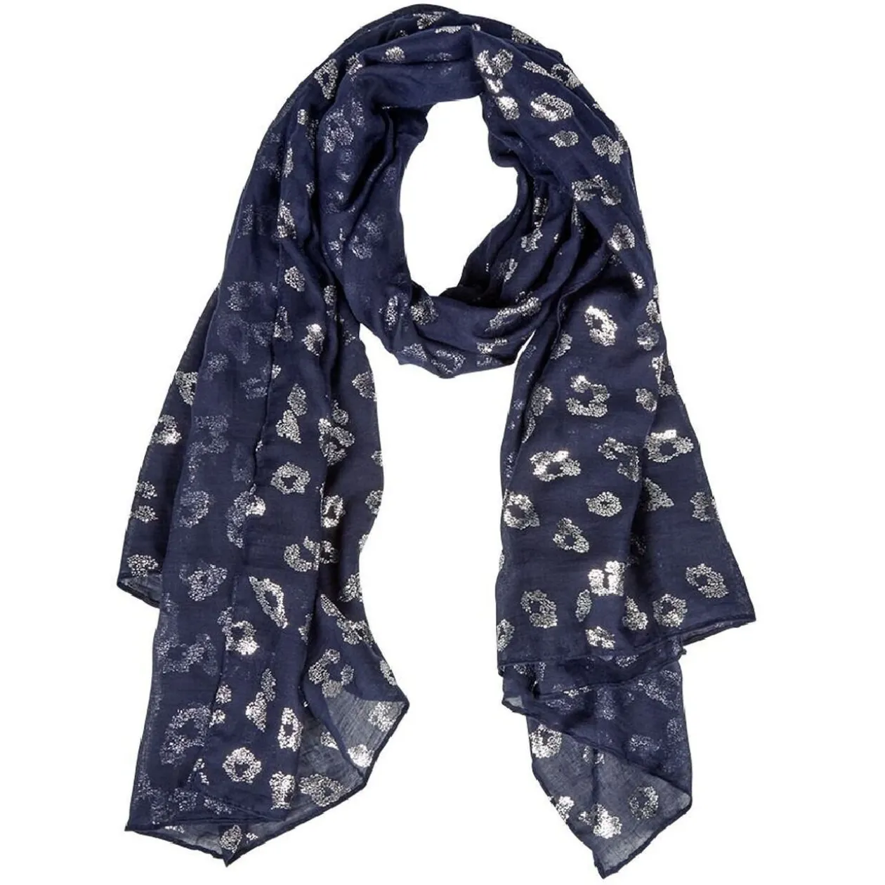 Foulard en polyester plissé à motif léopard bleu marine et argenté.
