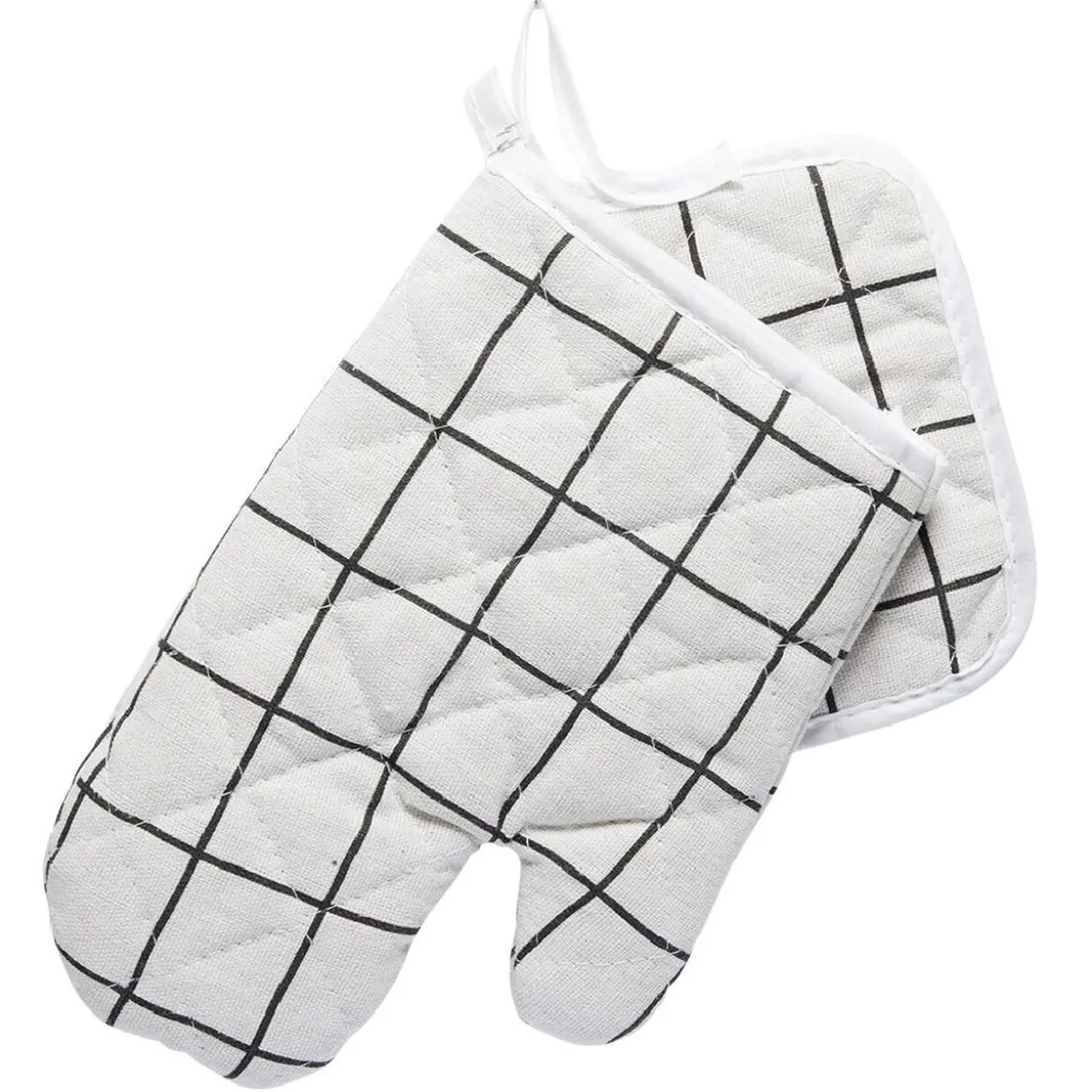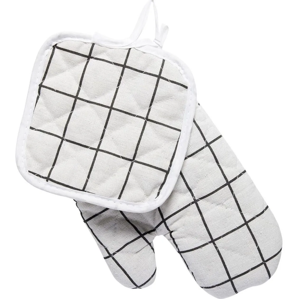 Gant de cuisine blanc quadrillé noir avec manique assortie, le lot idéal pour sortir vos plats chauds sans vous brûler.