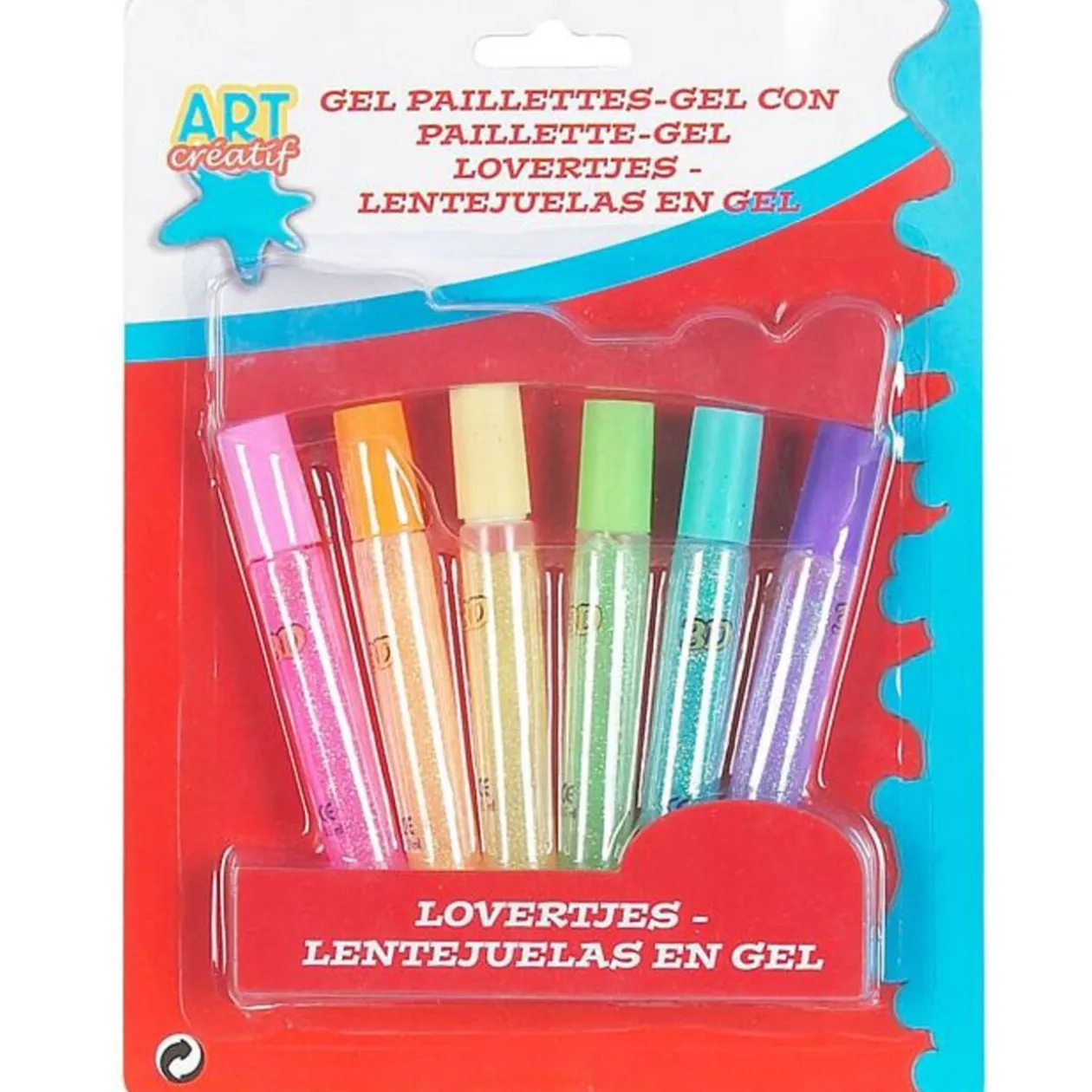 6 tubes de gel à paillettes de couleurs violet, bleu, vert, jaune, orange et rose.