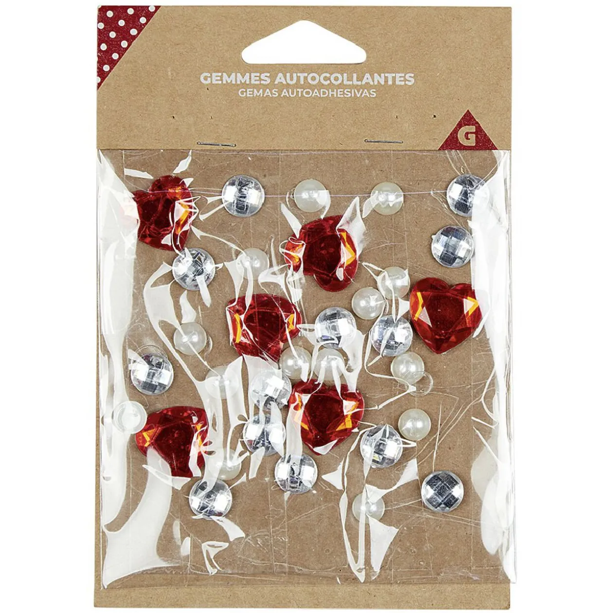 Assortiment de gemmes autocollantes : coeurs rouges, pierres cristal et boules blanches.